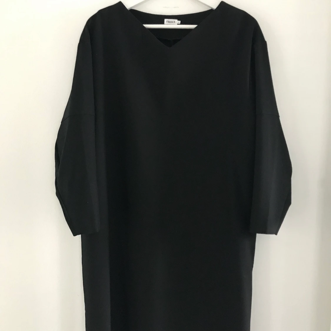 svart knälång klassisk rak klänning med v-ringning, polyester ceramica, lång ärm, nyskick