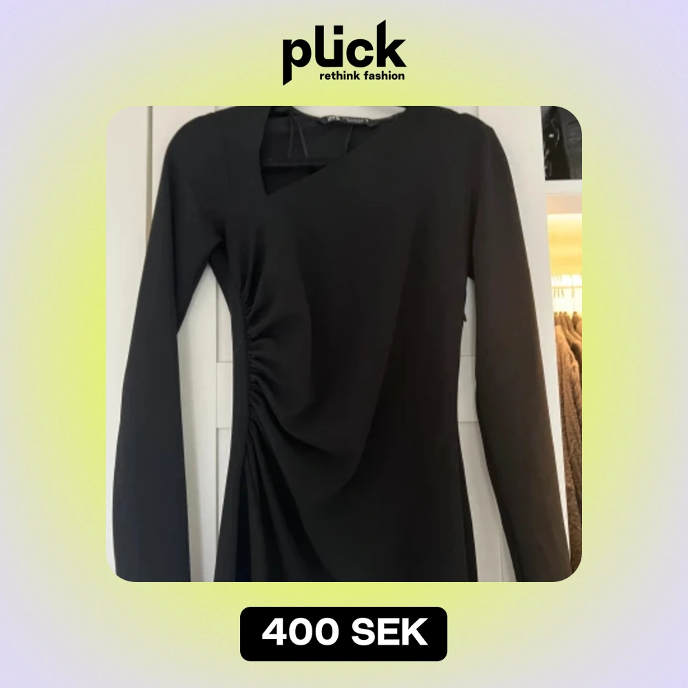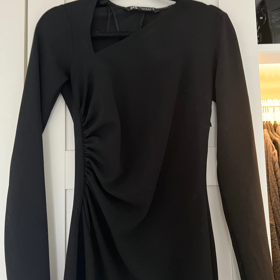 Säljer nu min suuuper fina svarta långklänning från zara🫶🏽 Använd få tillfällen så den är som ny. Snedskuren i fram, rynkdetalj i midjan och med slits.