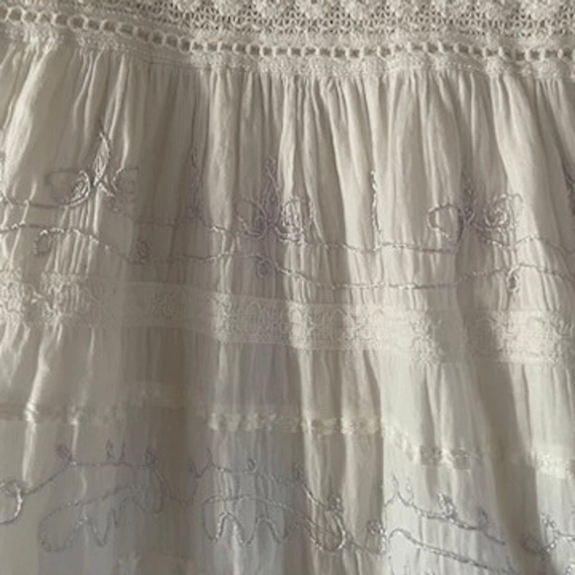 Superfin vit långklänning från Corte Hindú, köpte själv på en fransk söndagsmarknad för 35€. Klänningen har broderade detaljer, spets och volanger som ger en bohemisk vibe. Tillverkad i mjuk bomull, perfekt för varma dagar. Passar dig som gillar romantisk och avslappnad stil.