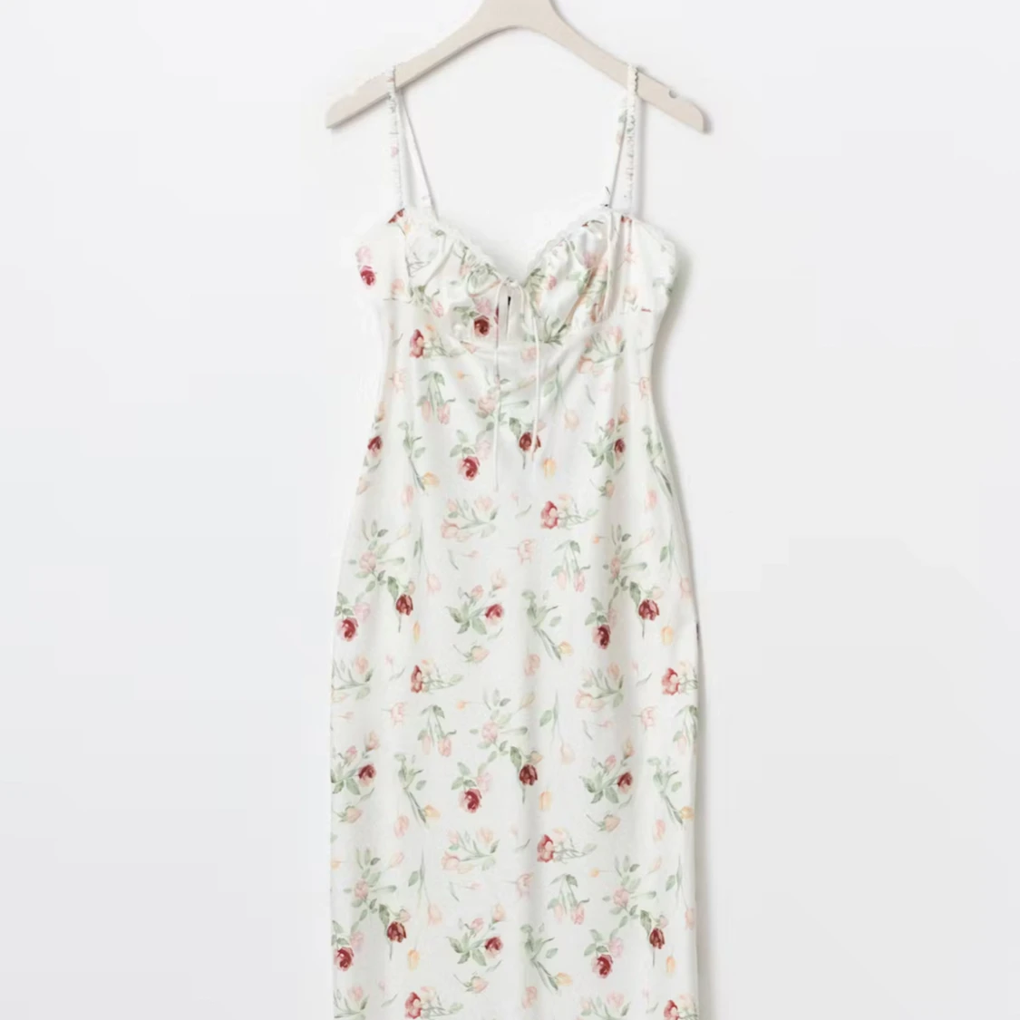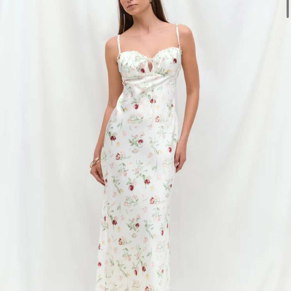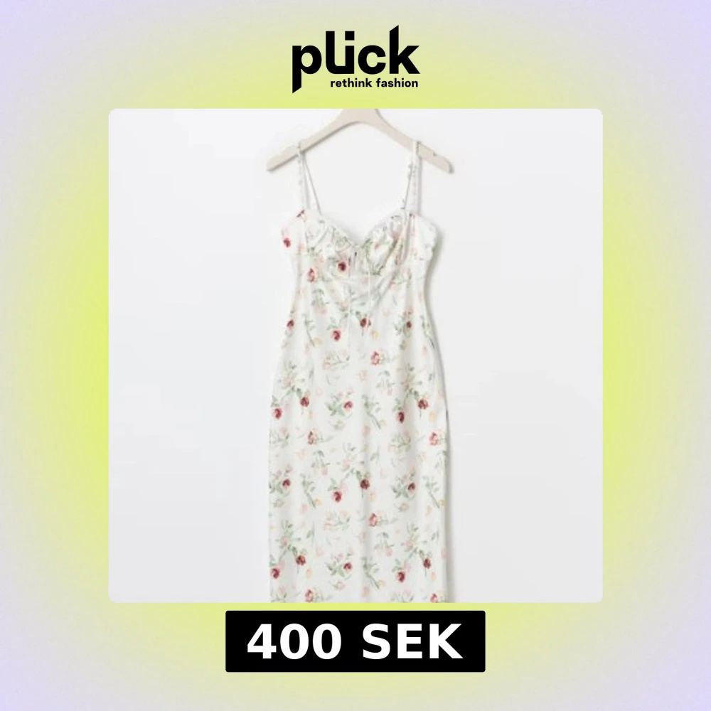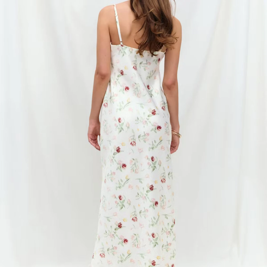 Helt ny, oanvänd prislappar kvar❤️Superfin långklänning i vit satin med romantiskt blommigt mönster i rosa, rött och grönt. Klänningen har smala axelband, v-ringad byst med snörning och en figurnära passform. Perfekt för dig som vill ha en dreamy och feminin look.