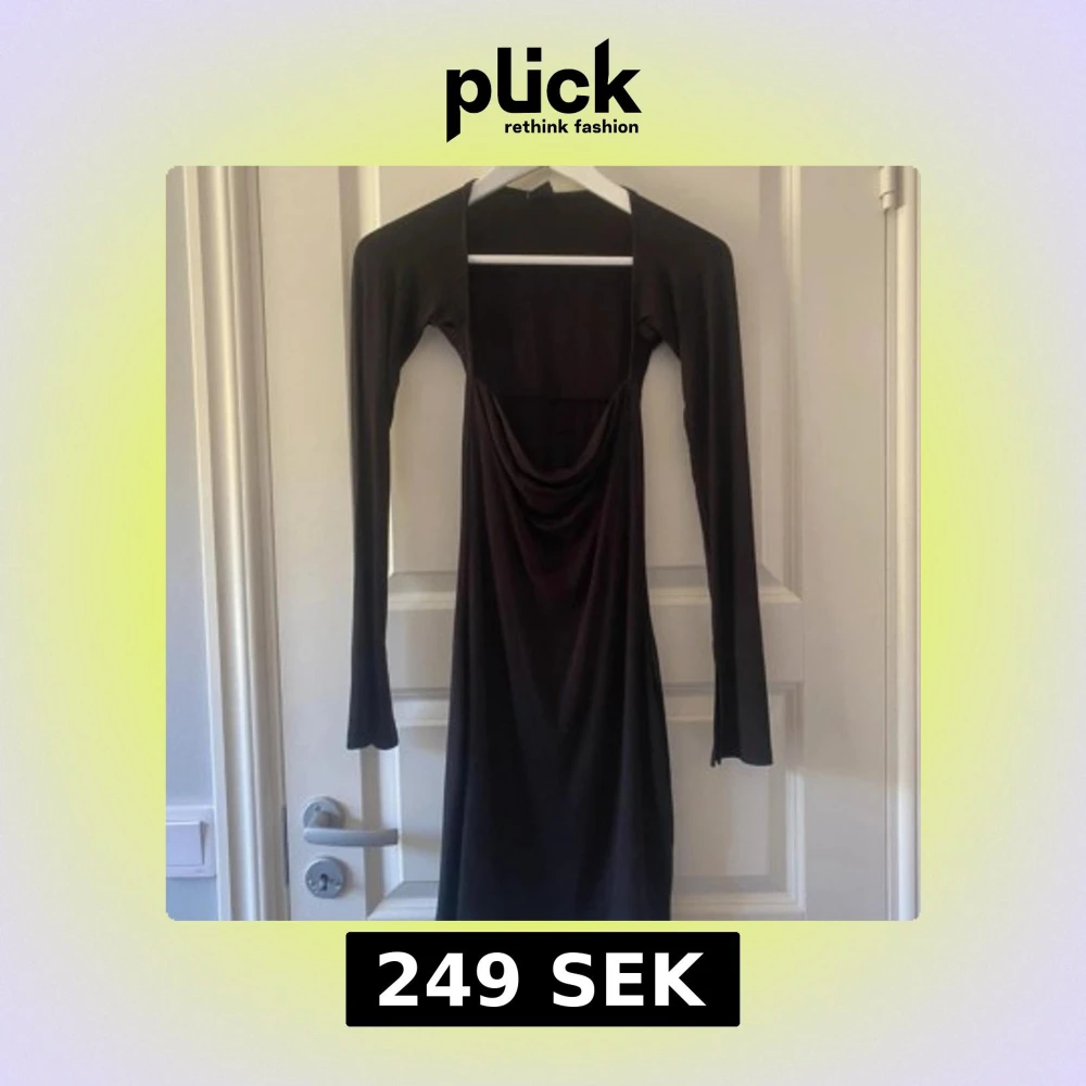 Svart långärmad klänning från Gina Tricot med snygg draperad urringning och figurnära passform. Klänningen är tillverkad i mjuk polyester och har långa, utsvängda ärmar. Perfekt för dig som gillar stilrena och trendiga plagg.