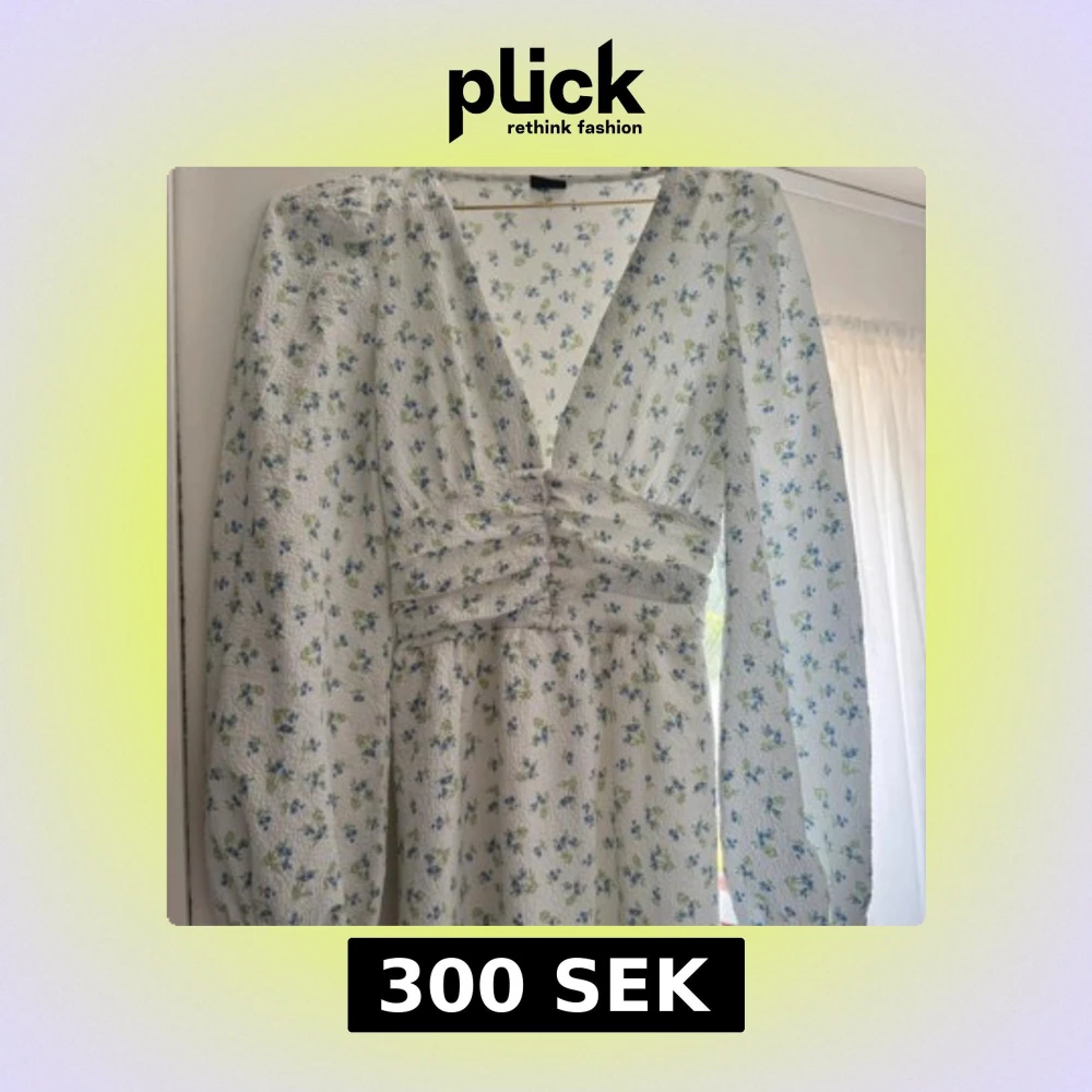 Supersöt långklänning från Gina Tricot i vitt med små blå och gröna blommor. Djup v-ringning, långa puffärmar och fina knappar framtill. Klänningen har en lätt strukturerad bomullskänsla och passar perfekt för sommarens alla tillfällen.
