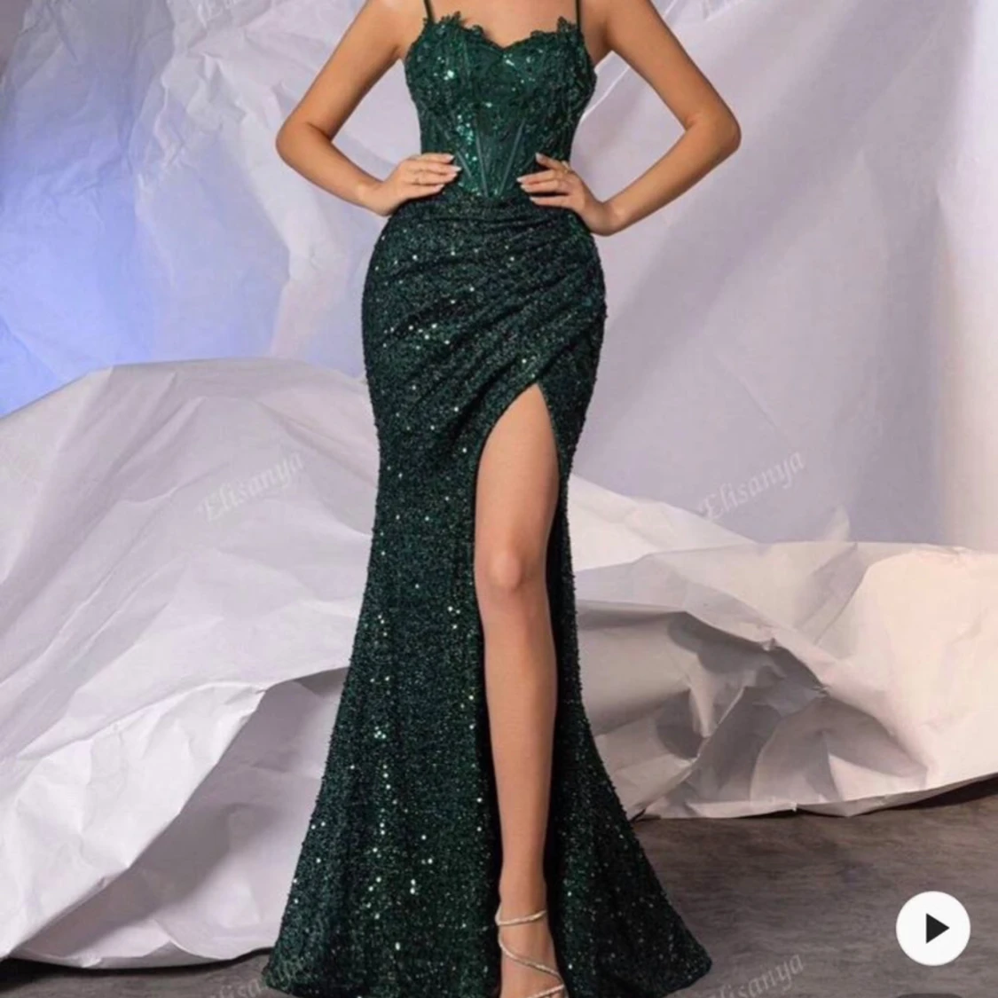 Magisk långklänning i glittrande mörkgrönt tyg med smala axelband och markerad midja. Klänningen har en hög slits framtill och figurnära passform som ger en riktigt snygg siluett. Perfekt för dig som vill sticka ut på bal eller fest! Aldrig använd bara testad. Köpt för 950💕