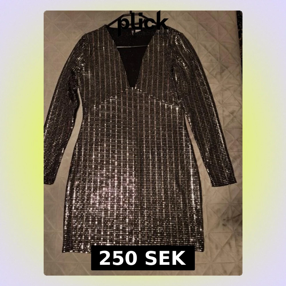 Snygg kort glittrig klänning från H&M Divided i storlek M. Klänningen har lång ärm, djup v-ringning och är täckt av silverfärgade paljetter i ett randigt mönster. Perfekt för dig som vill sticka ut med en festlig look.