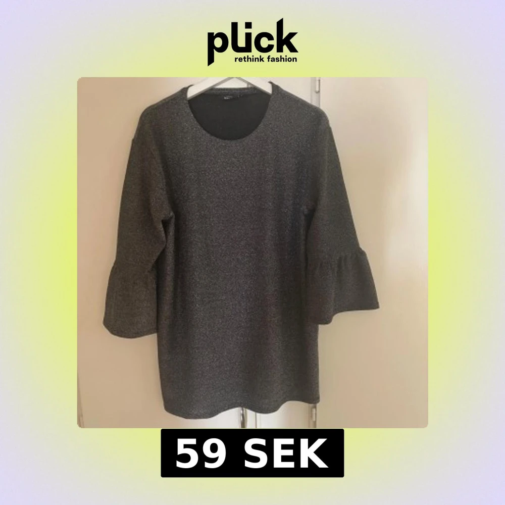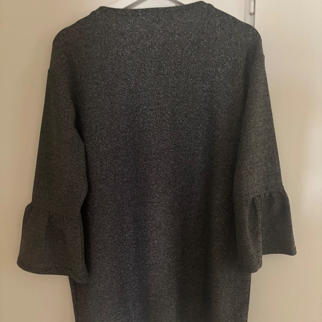 Snygg svart topp med glittrigt tyg och rund halsringning. Den har trekvartsärmar med volangdetalj som ger en extra touch.