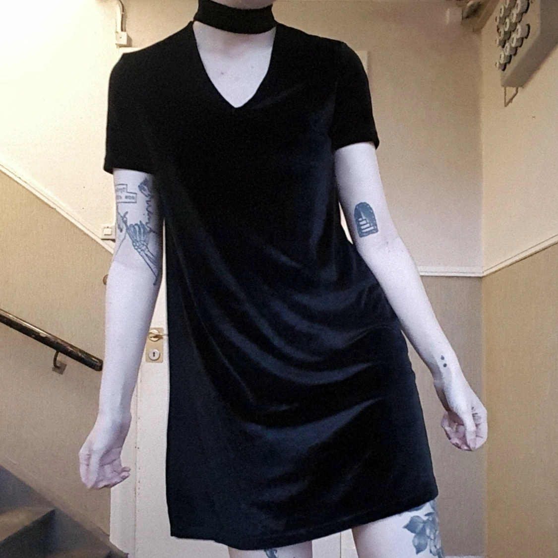Helsvart tshirtklänning i sammet!! 🖤 Väldigt behaglig att ha på sig och såå snygg med cutout choker 😍 Stängs med dold dragkedja i ryggen Storlek xs men oversized! Passar xs-m! 120kr inkl frakt