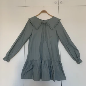 Så gullig klänning som jag aldrig använt. Extremt söta detaljer med kragen och rosetter fram. Gråblå i färgen och passar perfekt till hösten till ett par boots eller ballerinaskor