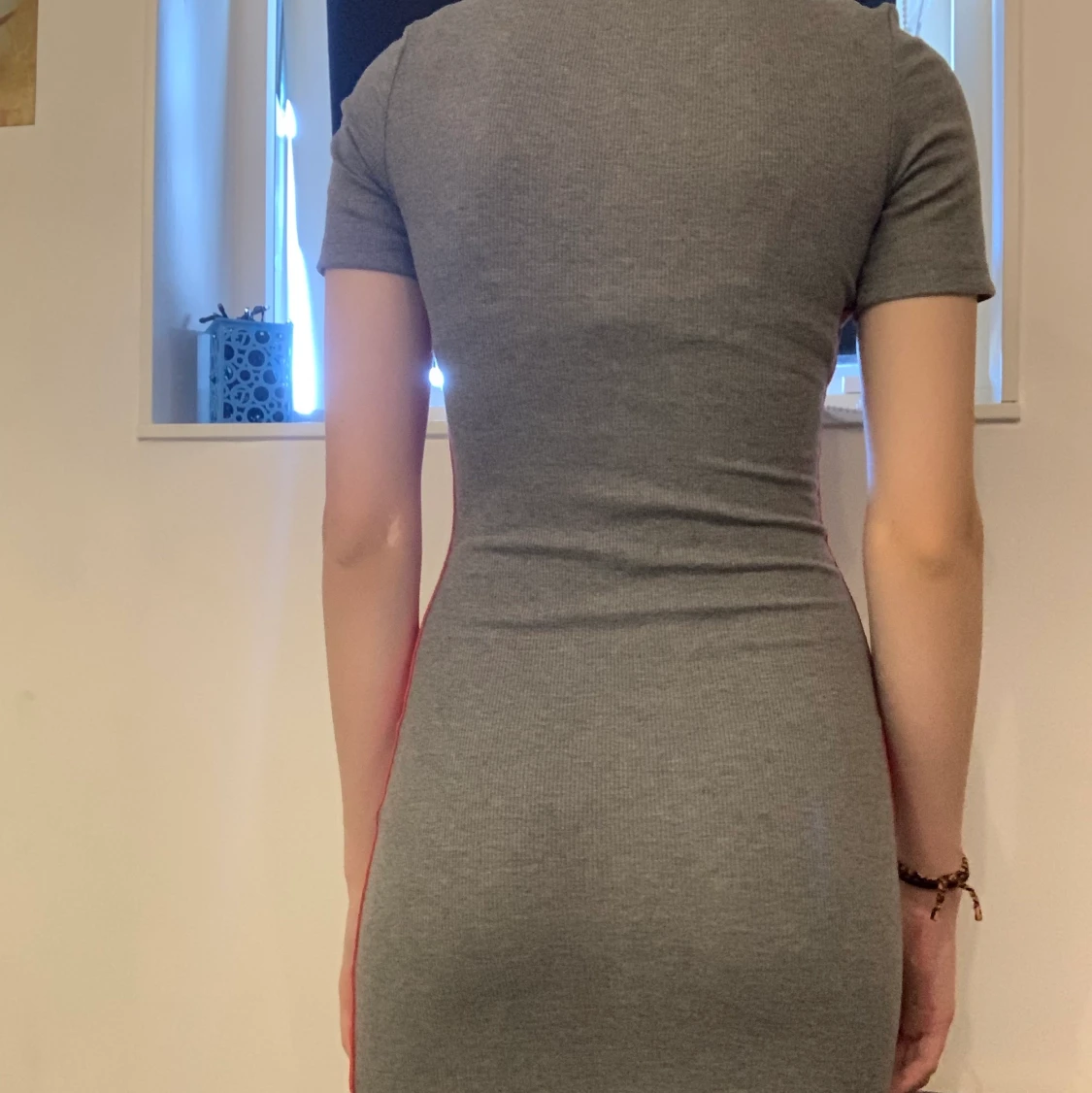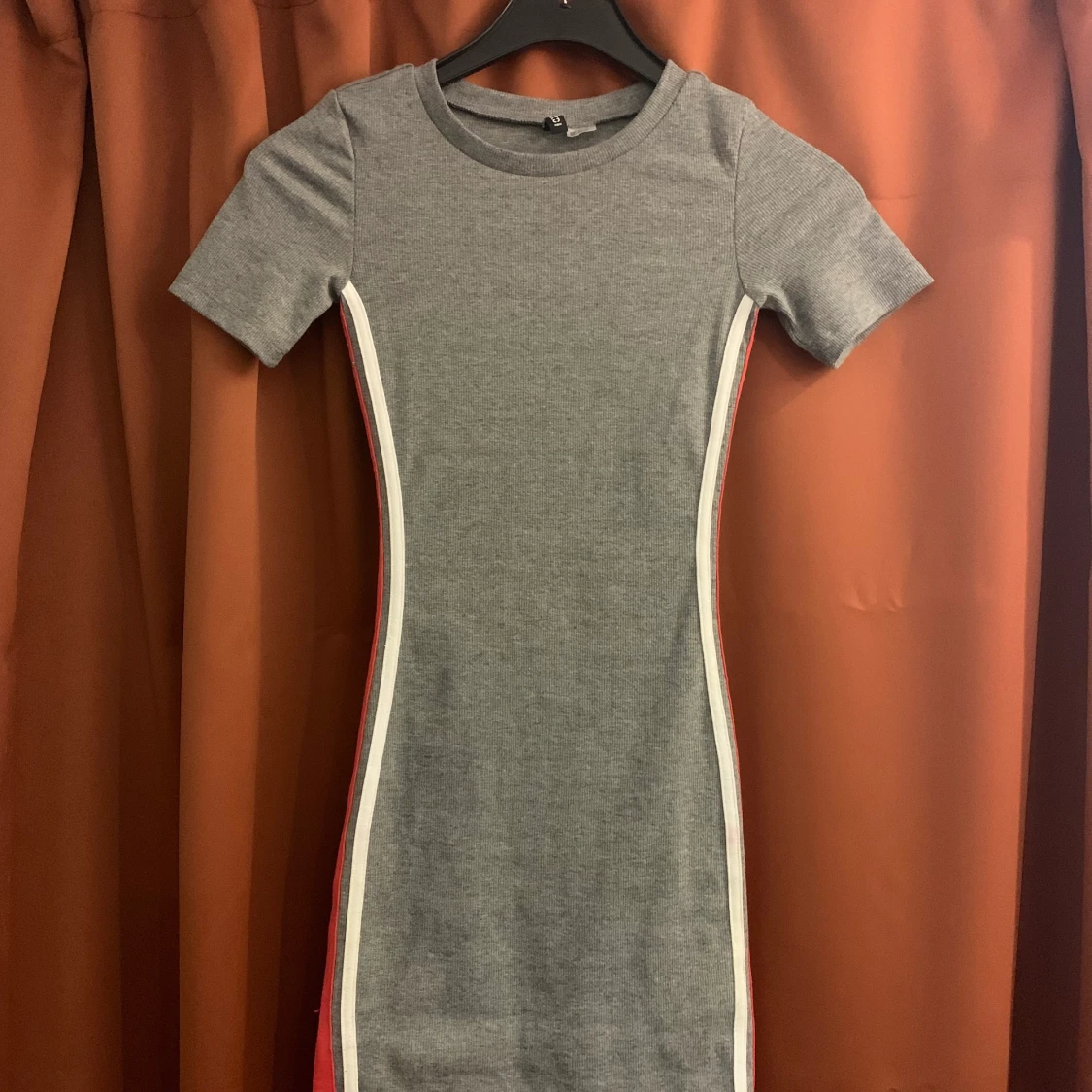 En grå klänning med vita och röda linjer på sidan, köptes på H&M för 149kr || Använt ca 2 ggr || Köparen står för frakt ||