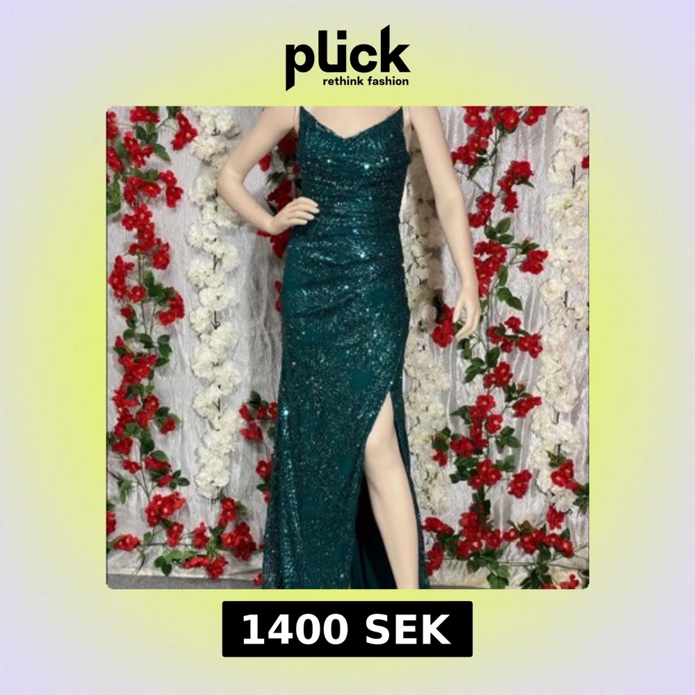 Snygg grön långklänning med glittrande paljetter och en elegant slits. Klänningen har smala axelband och en figurnära passform som framhäver silhuetten. Perfekt för en festlig kväll!