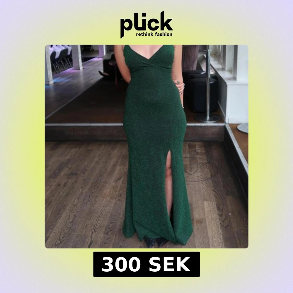 Snygg grön långklänning från WalG med glittrigt material och smala axelband. Klänningen har en djup v-ringning och en elegant slits framtill. Perfekt för en festlig kväll!