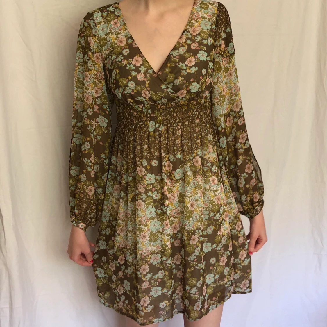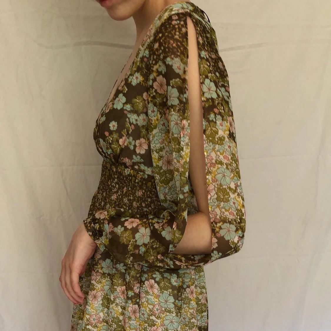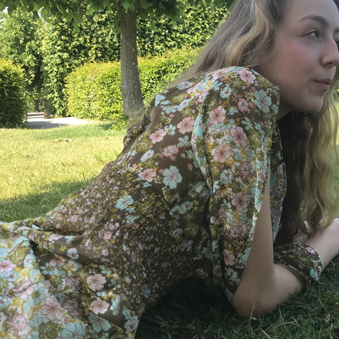 Säljer denna vackra och romantiska sommarklänning med blomsterdetaljer, då den inte längre kommer till användning. 70-tals inspirerad silhuett med en ”slit” i ärmarna (som lätt går att sy igen om man vill det). Yttersta lagret är i ett skirt tyg, men den är fodrad i ett mjukare beigt. Faller jättefint, perfekt till sommaren. Mycket bra skick. Passar xs-m