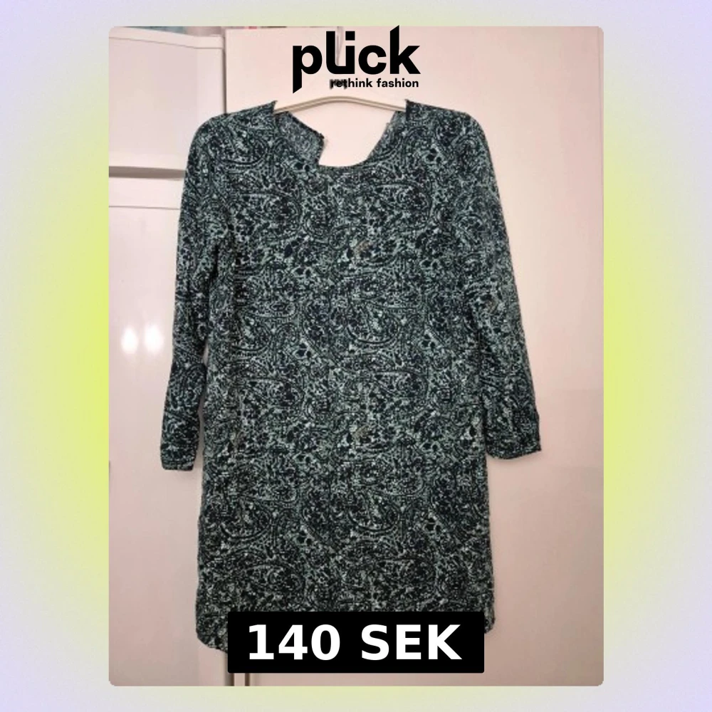 Snygg klänning från Jacqueline de Yong i storlek 38. Klänningen har ett mörkblått och vitt mönster, långärmad design och v-ringad hals. Materialet är mjukt och lätt, perfekt för dig som gillar att sticka ut med coola prints.