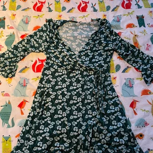 Hej jag säljer min gröna sommarklänning med vita blommor. Jätte fin volang vid slutet på ärmarna och knytning vid magen för att få en fin form på kroppen!
