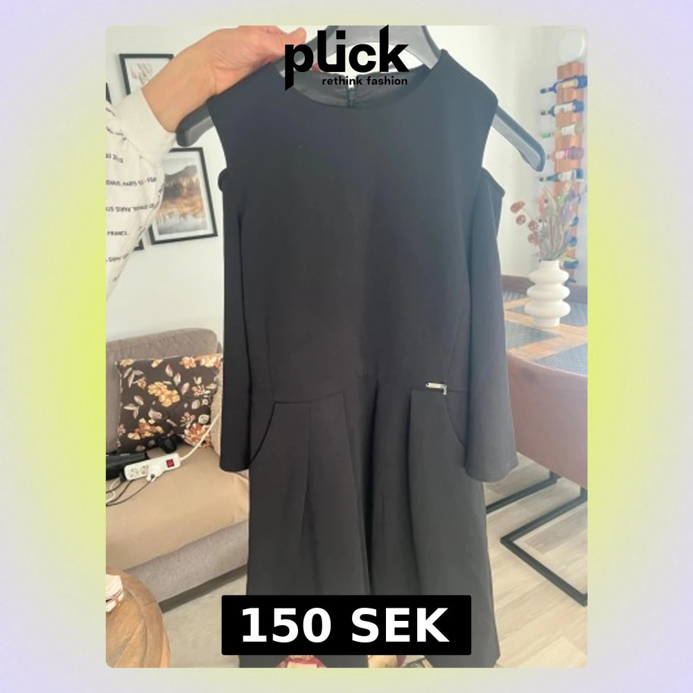 Snygg svart klänning från Guess med markerad midja och lätt utställd kjol. Klänningen har långa ärmar med cold shoulder-detalj och dragkedja i ryggen. Stilren design med liten metallogo vid fickan. Perfekt för dig som gillar klassisk men trendig look.