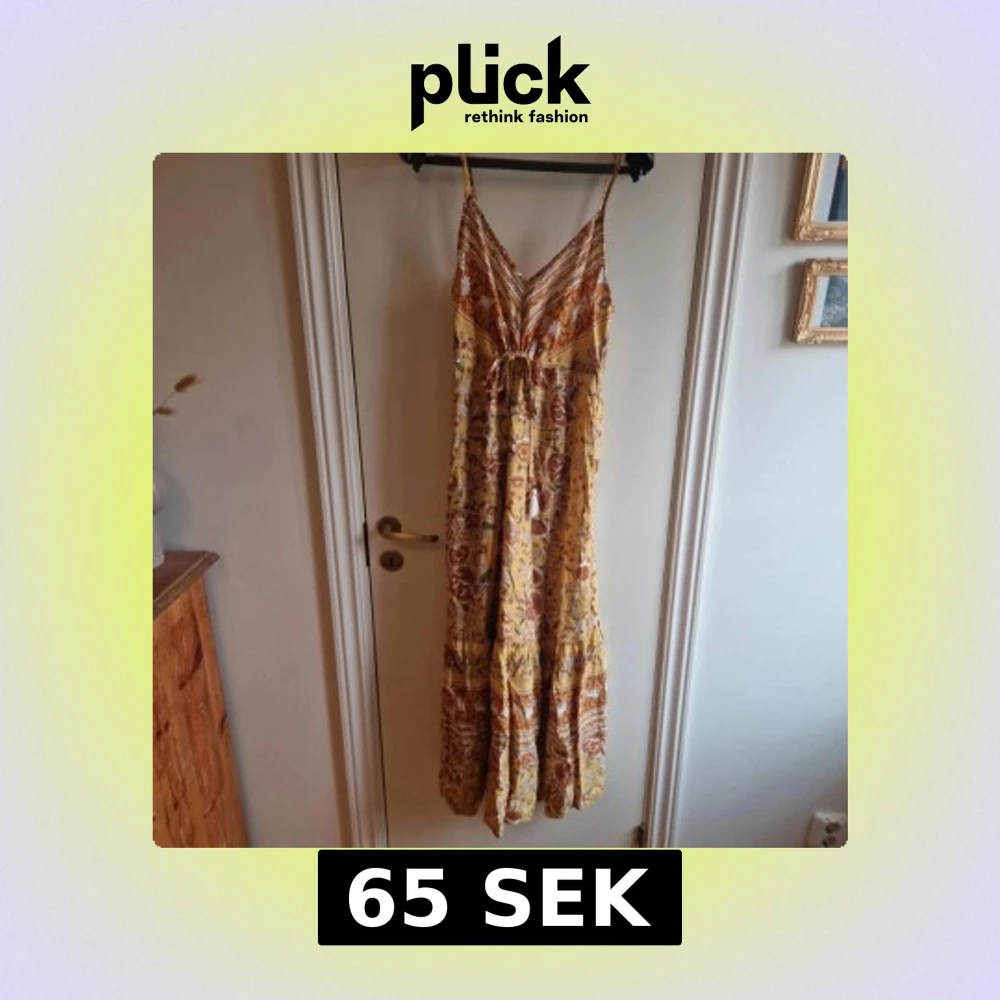 Säljer en vacker gul långklänning med blommigt mönster och smala axelband. Klänningen har en v-ringad design och knytning i midjan för en justerbar passform. Perfekt för sommarens varma dagar.