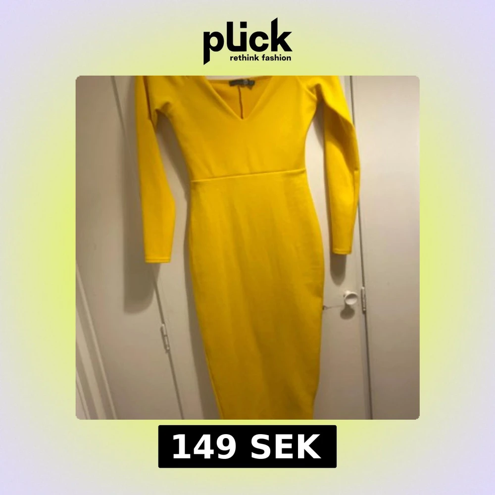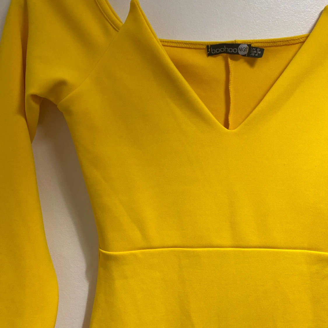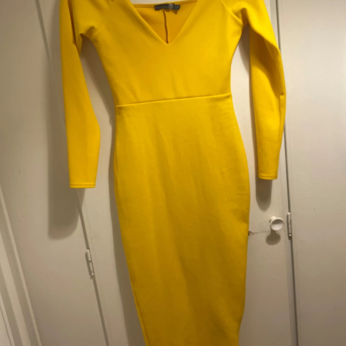 Snygg gul långklänning från Boohoo med v-ringad hals och långärmade ärmar. Klänningen har en figurnära passform och är tillverkad i mjukt polyester-material. Perfekt för dig som vill sticka ut med en färgstark look.
