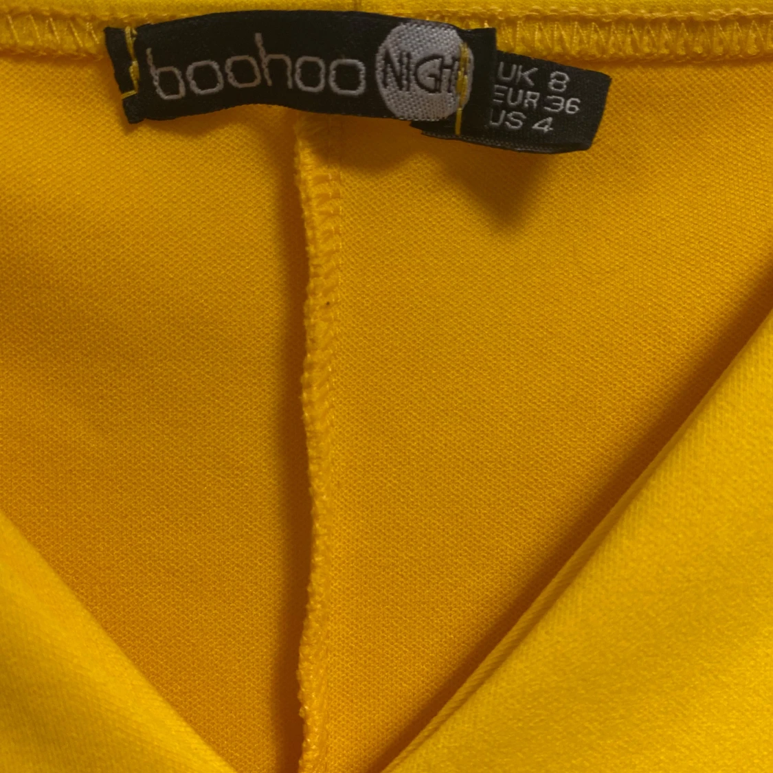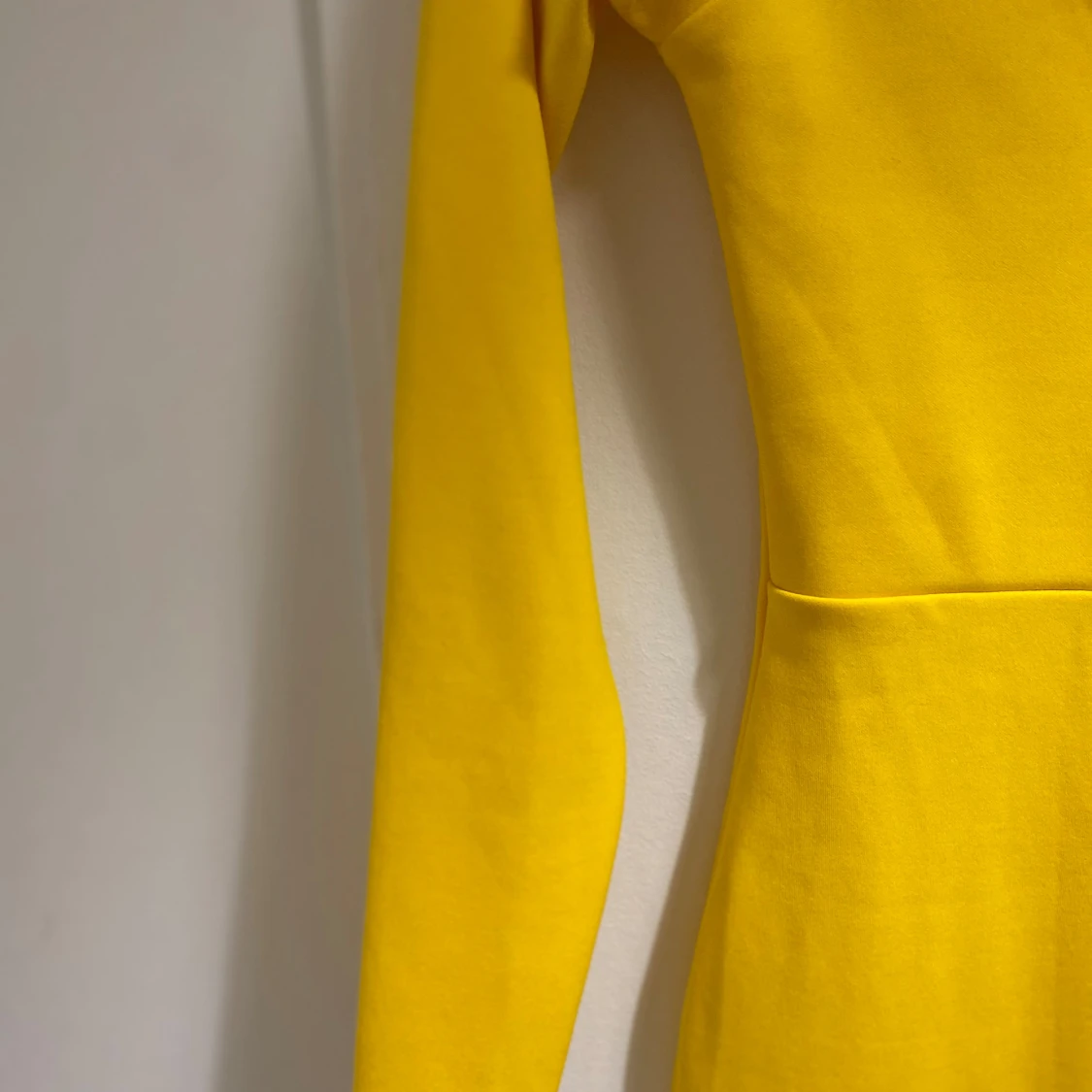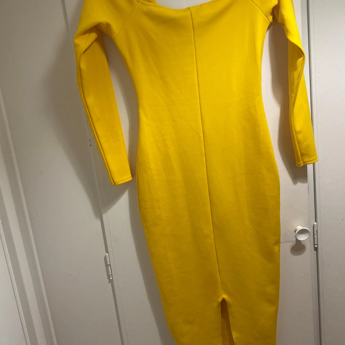 Snygg gul långklänning från Boohoo med v-ringad hals och långärmade ärmar. Klänningen har en figurnära passform och är tillverkad i mjukt polyester-material. Perfekt för dig som vill sticka ut med en färgstark look.