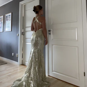 Säljer min fina balklänning som jag hade på studenten, en figursydd balklänning med paljetter. Djup i ryggen och med ett fint släp. Passar mig som normalt är en small. Extra tyg tillkommer!