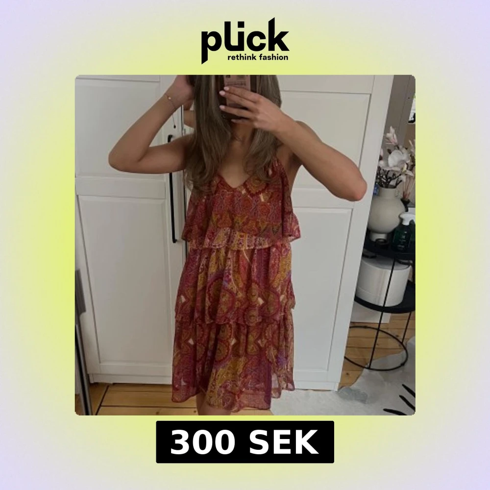 Mönstrad klänning från Zara i rött, gult och orange. Klänningen har volanger och en v-ringning. Öppen rygg med korsade band. Helt oanvänd!!