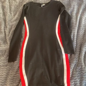 En svart takt klänning med röd och vitt sträck på sidorna kommer från H&M i storlek 32. Använd en gång 💝