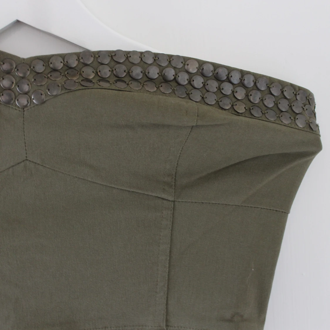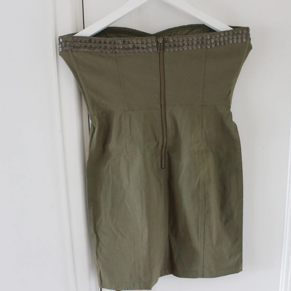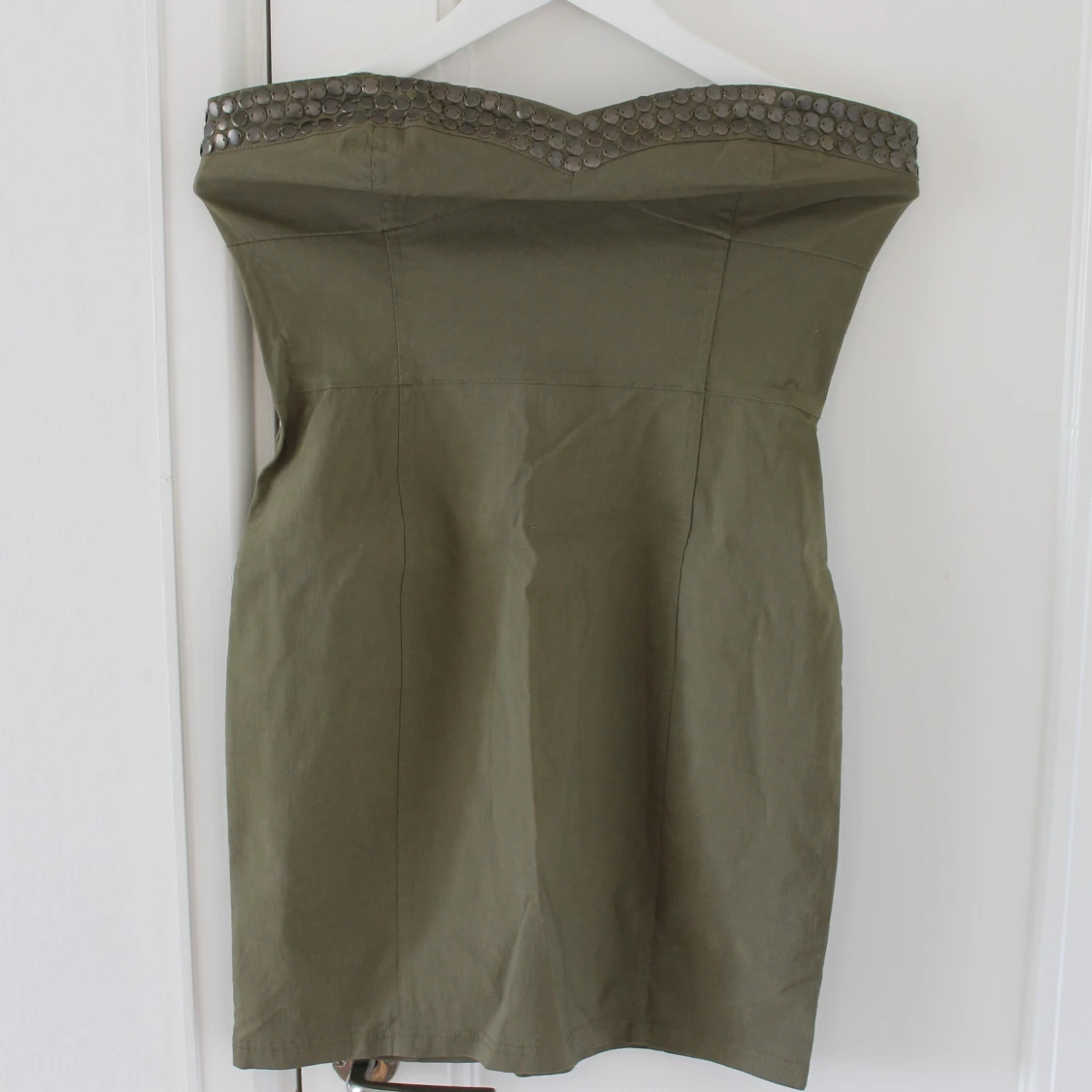 Kort slimmad klänning med nitar samt dragkedja i ryggen som endast är använd engång. Banden till klänningen saknas men väldigt fin utan. 🤍 Köparen står för frakt. Hör av dig om fler bilder önskas eller om du har någon annan fråga.