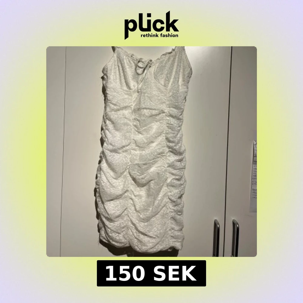 Säljer en elegant vit klänning med ett vackert draperat mönster. Klänningen har en åtsittande passform och är perfekt för festliga tillfällen.