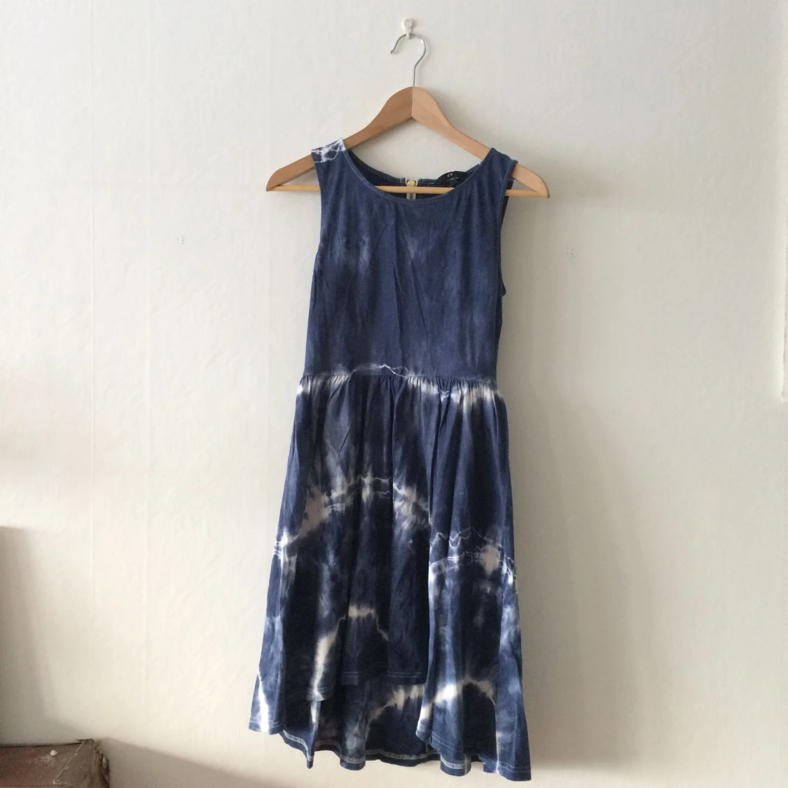 Klänning från hm som är vit i grunden och batikad av mig i blått. Väldigt skön! Kjolen är lite klockad och något längre baktill.