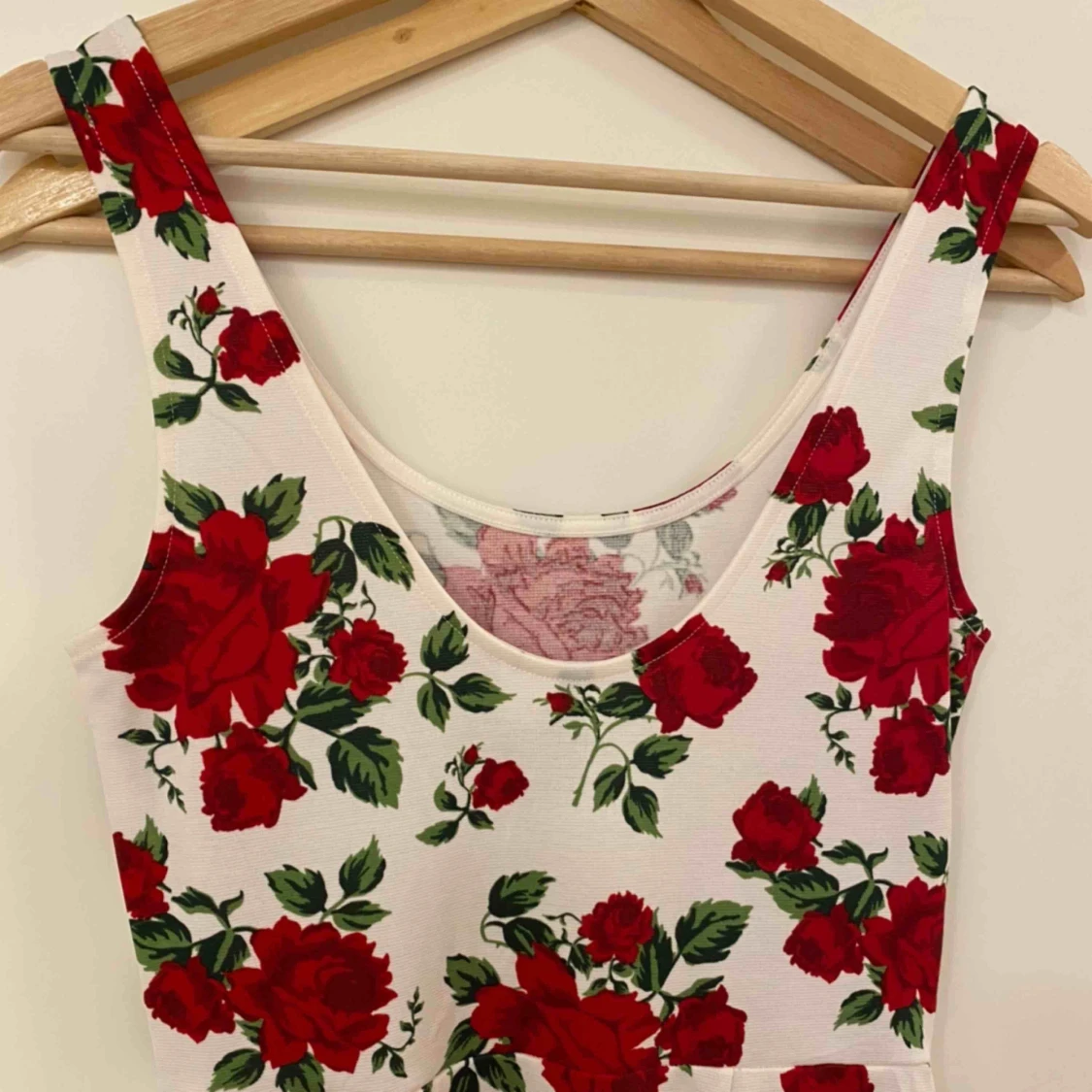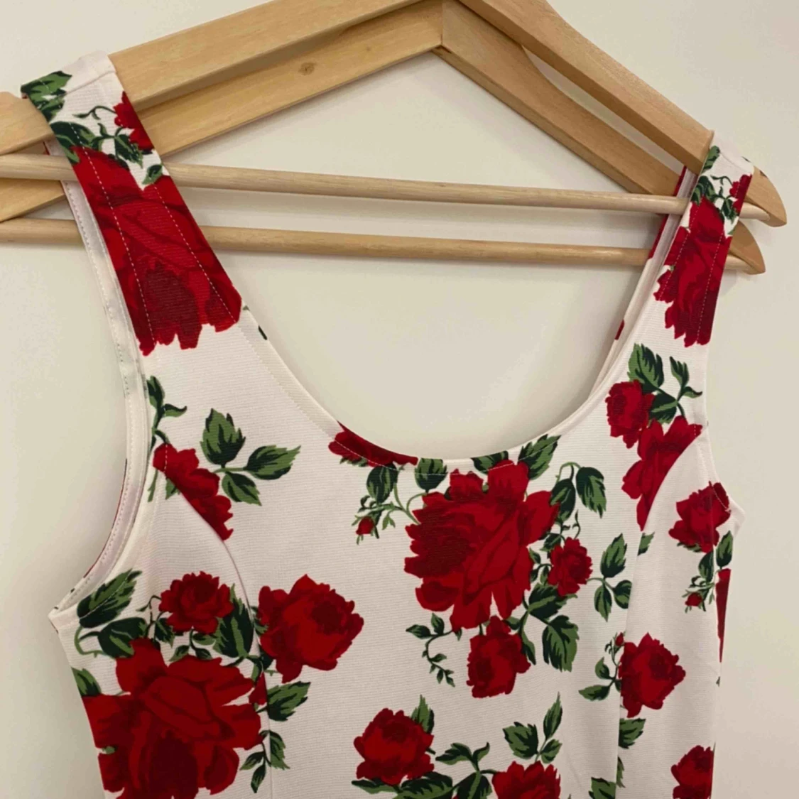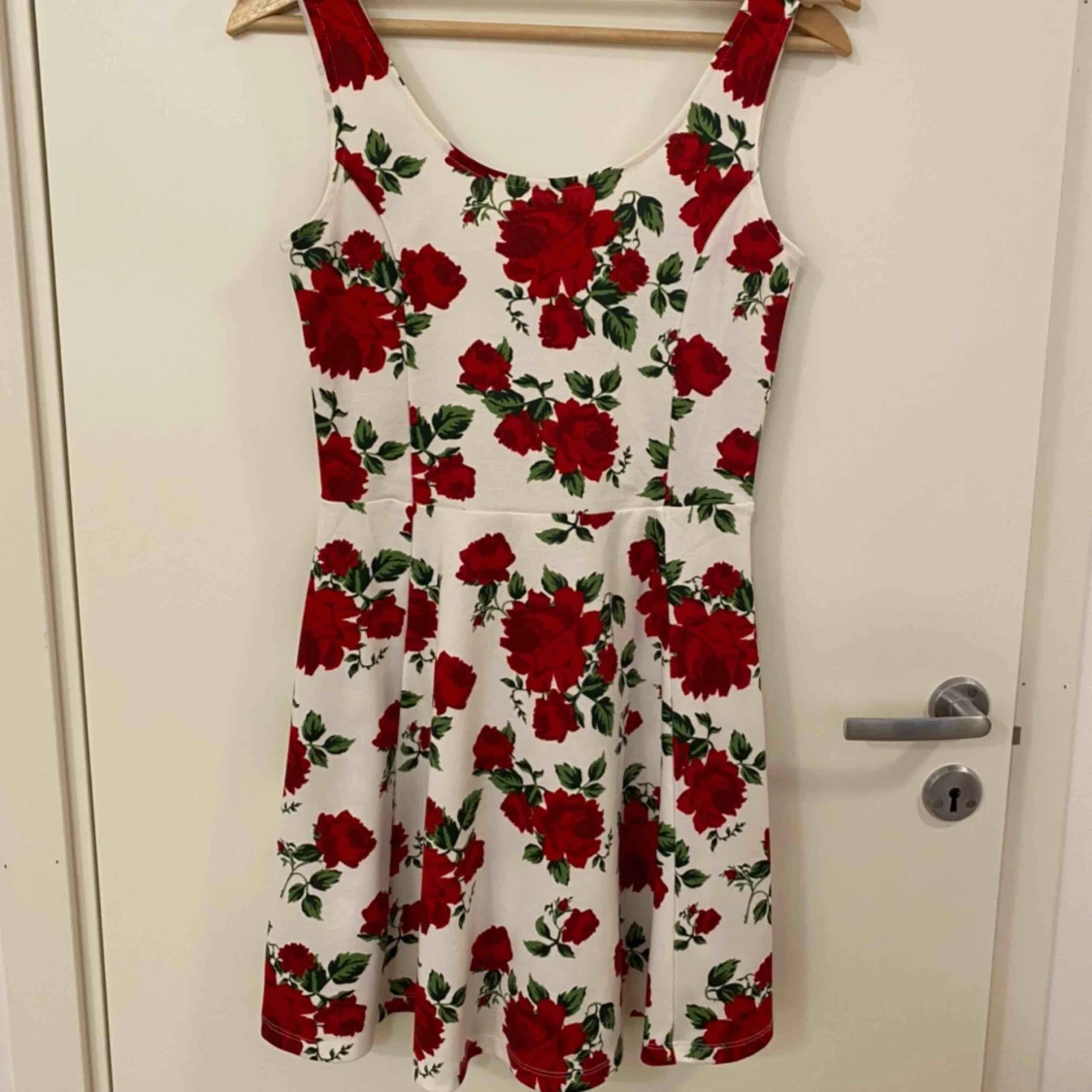 Stretchiga klänning med ros mönster. Utsvängande kjol med lite längre öppning på ryggen. Aldrig använd