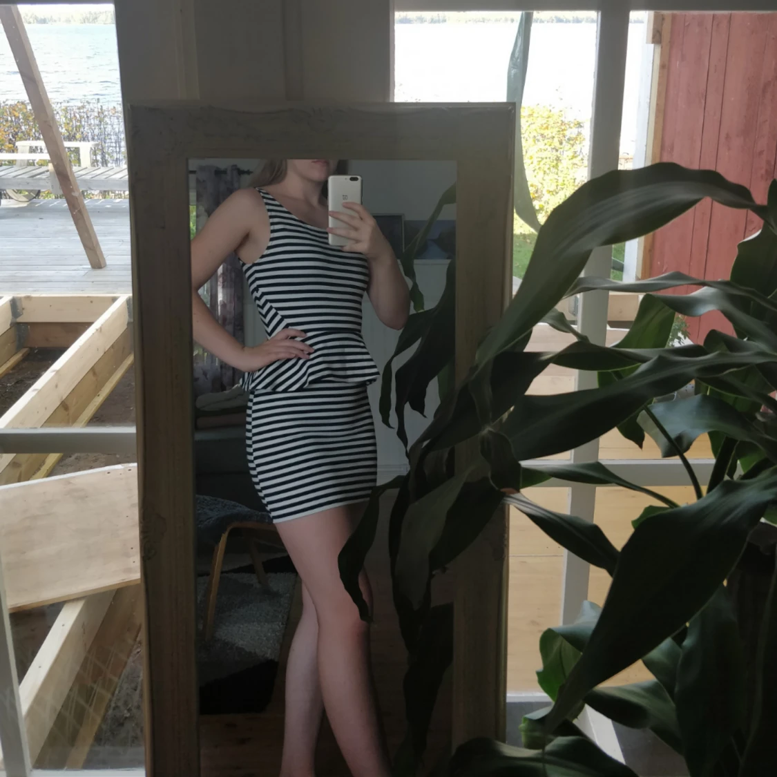 Pris 65 (frakt ingår!) En superfin enkel klänning från H&M köpt för något år sedan. Använd 1 gång, säljer då jag växt ur den. Bra i storlek, absolut en 34:a! INGA FEL på den! Den är vit + mörkblå/svart, V-ringad i ryggen! Skriv om du undrar något! :)