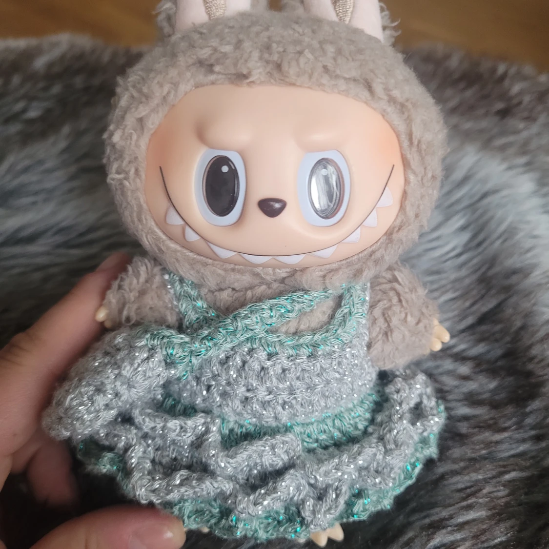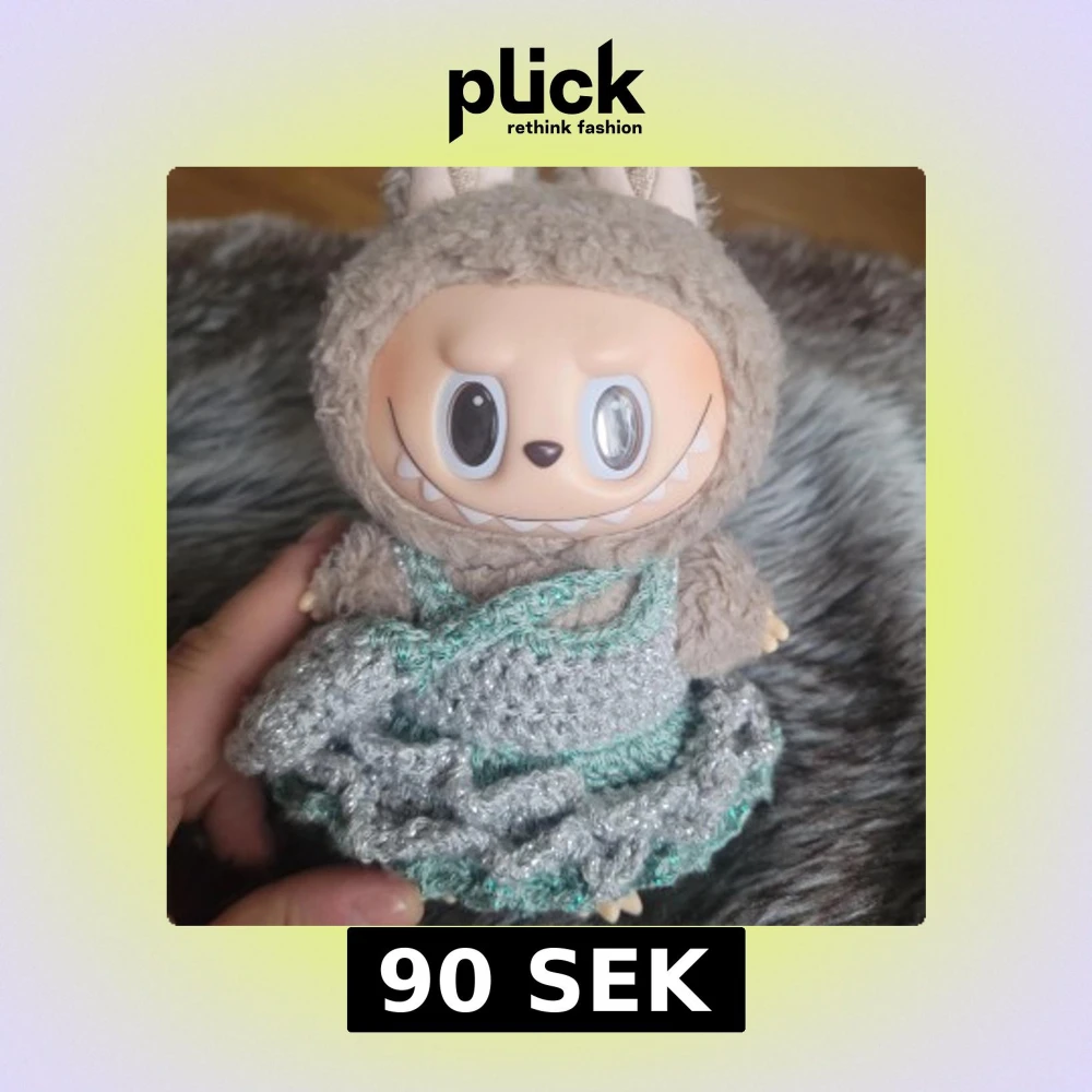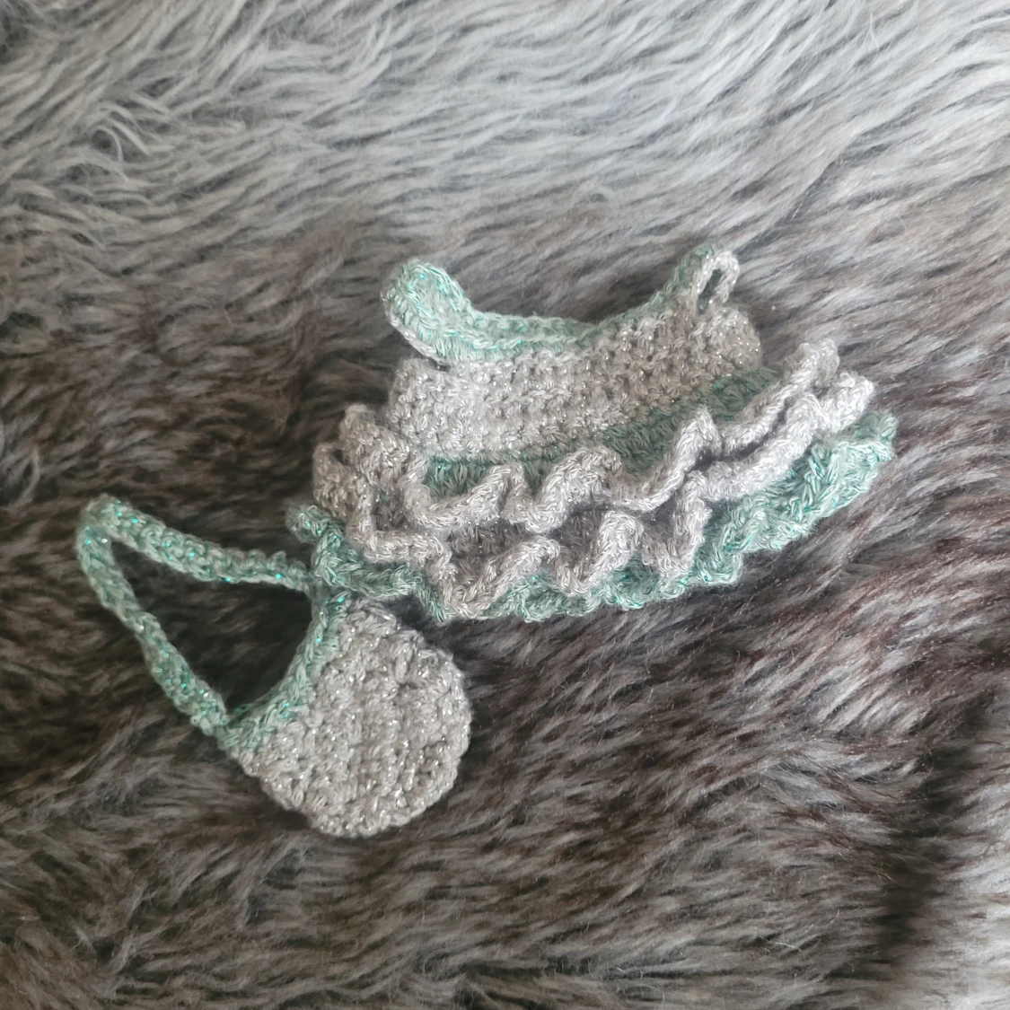 Supersöt handvirkad klänning i silvergrått och mintgrönt garn med glittriga detaljer. Klänningen har volangkant och matchande liten väska. Perfekt för att ge dockan en unik och gullig look.