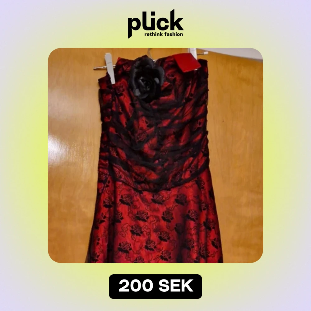 Rödsvart klänning med blommor på från Hell Bunny. Dragkedja bak och röda band att knyta bakom nacken. Sparsamt använd i fint skick. Lite insydd som kan läggas ut igen. Okej att komma med egna bud. Katt i hemmet.