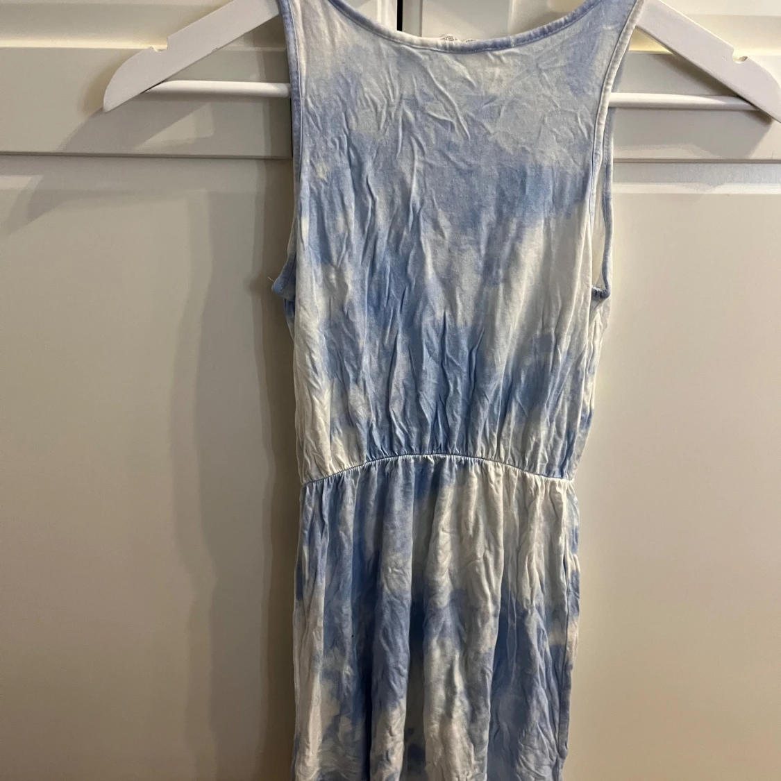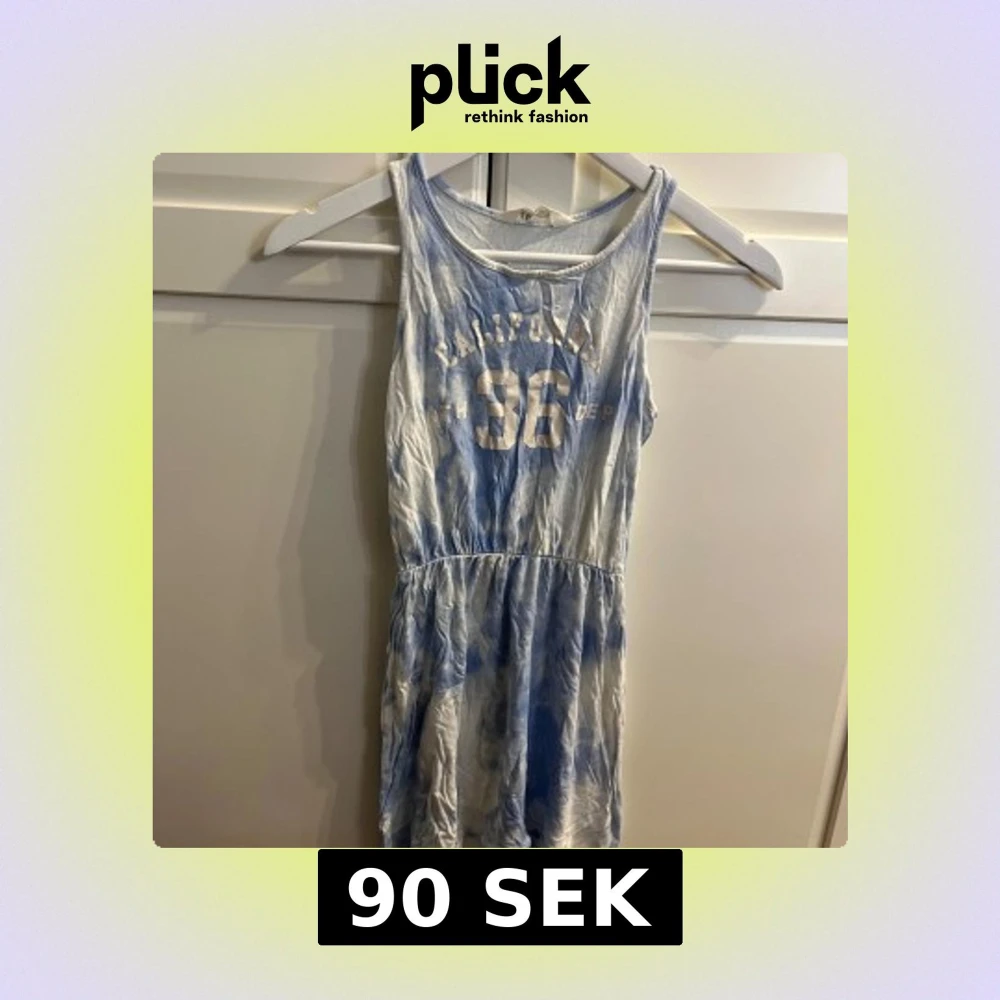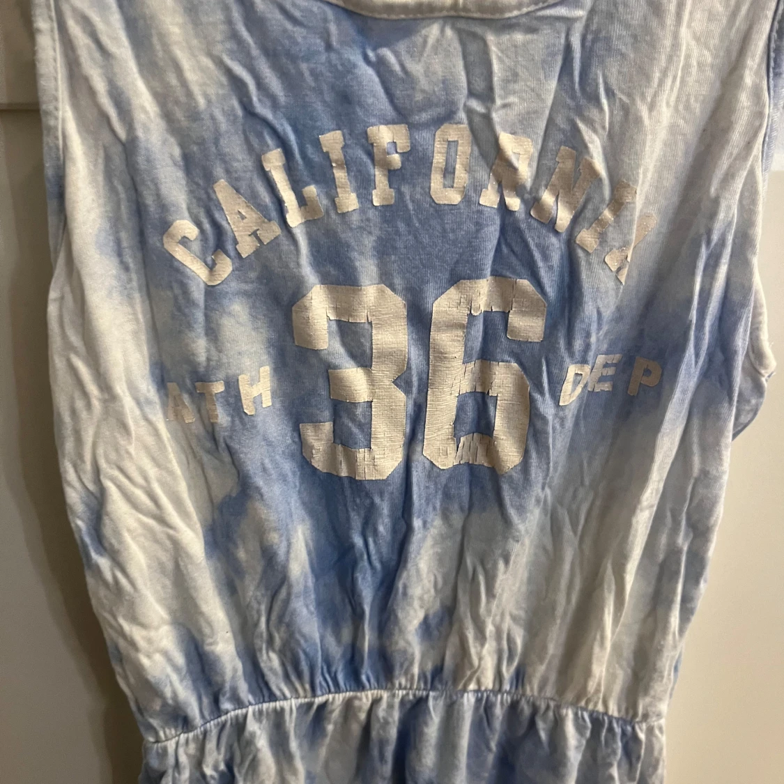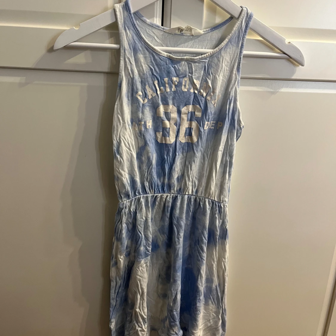 Säljer en cool blå och vit klänning från H&M med texten 'California 36' på framsidan. Klänningen har en avslappnad passform och ärmlös design, perfekt för varma dagar. Den har ett elastiskt band i midjan för en bekväm passform.