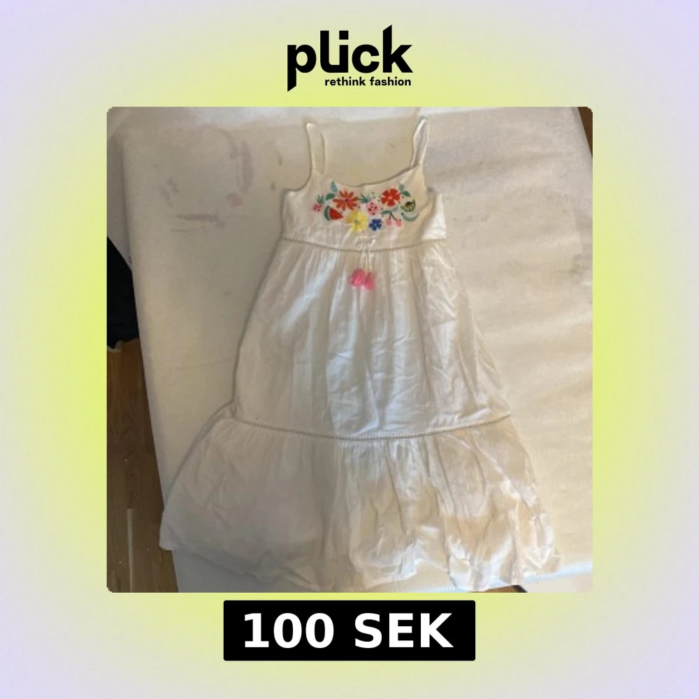 Charmig vit klänning från H&M med färgglada broderade blommor på bröstet och rosa tofsdetaljer. Klänningen har smala axelband och en luftig passform, perfekt för varma dagar! Klänning för barn!