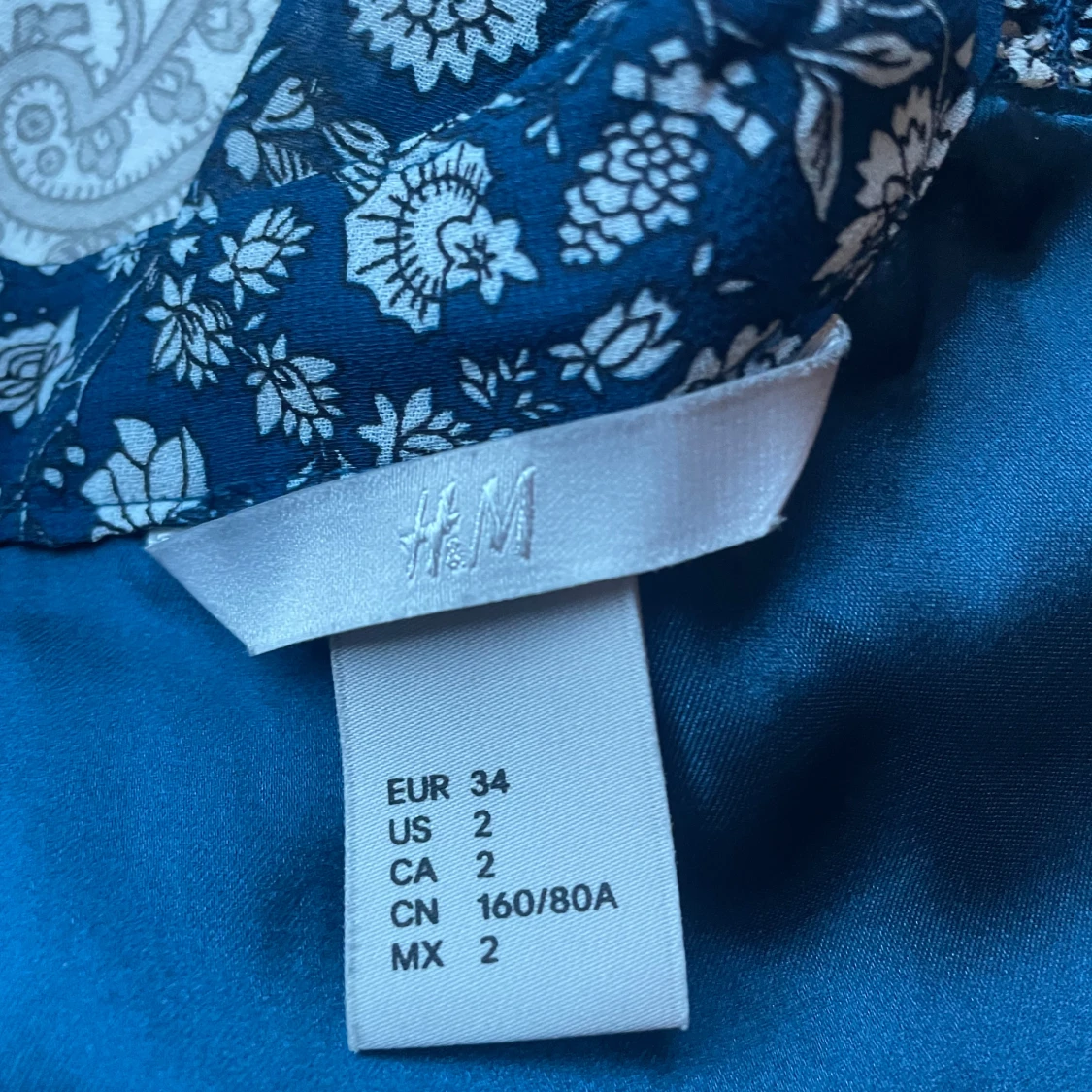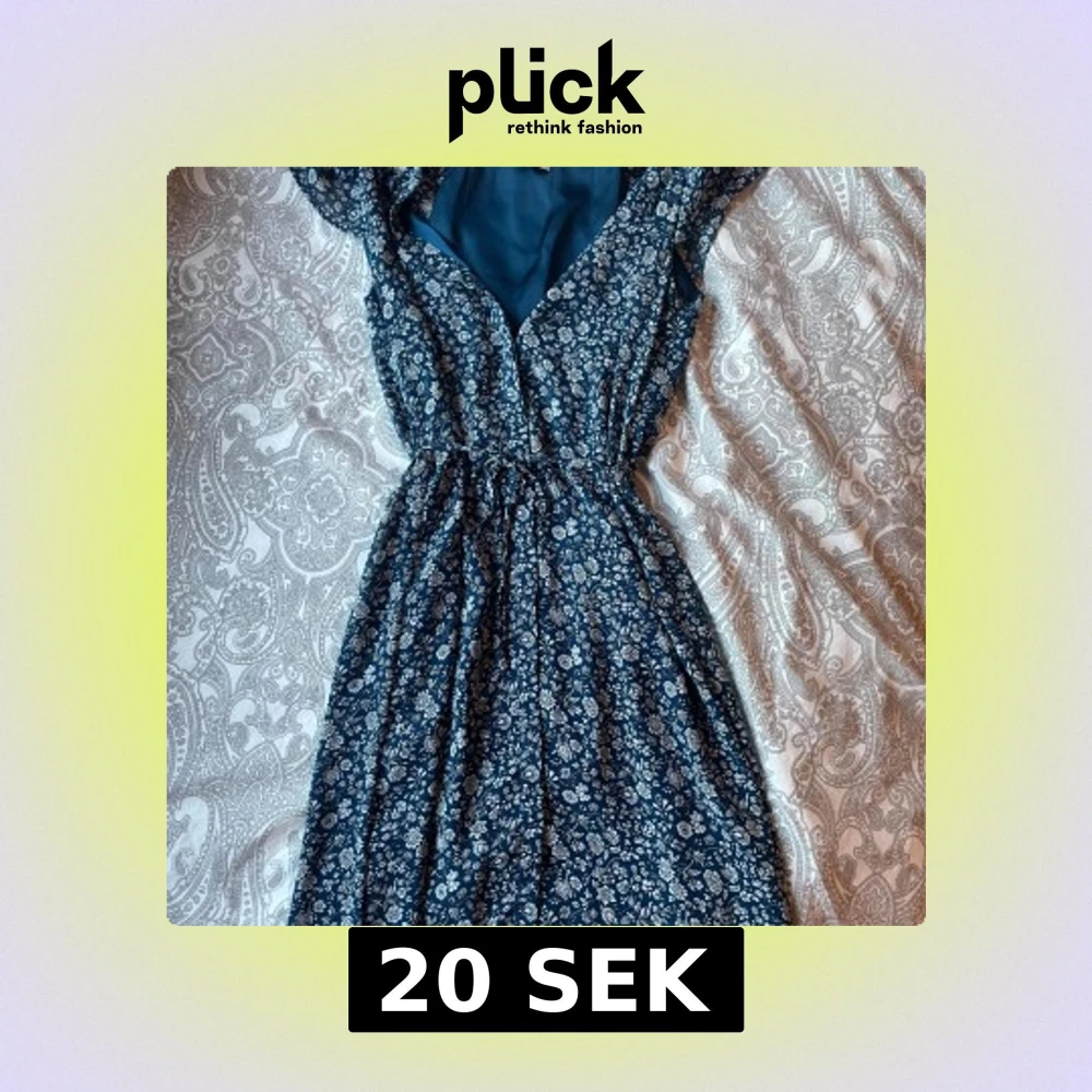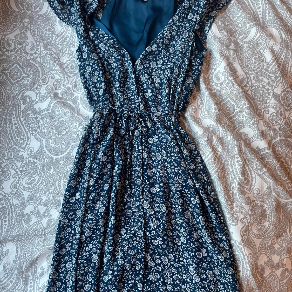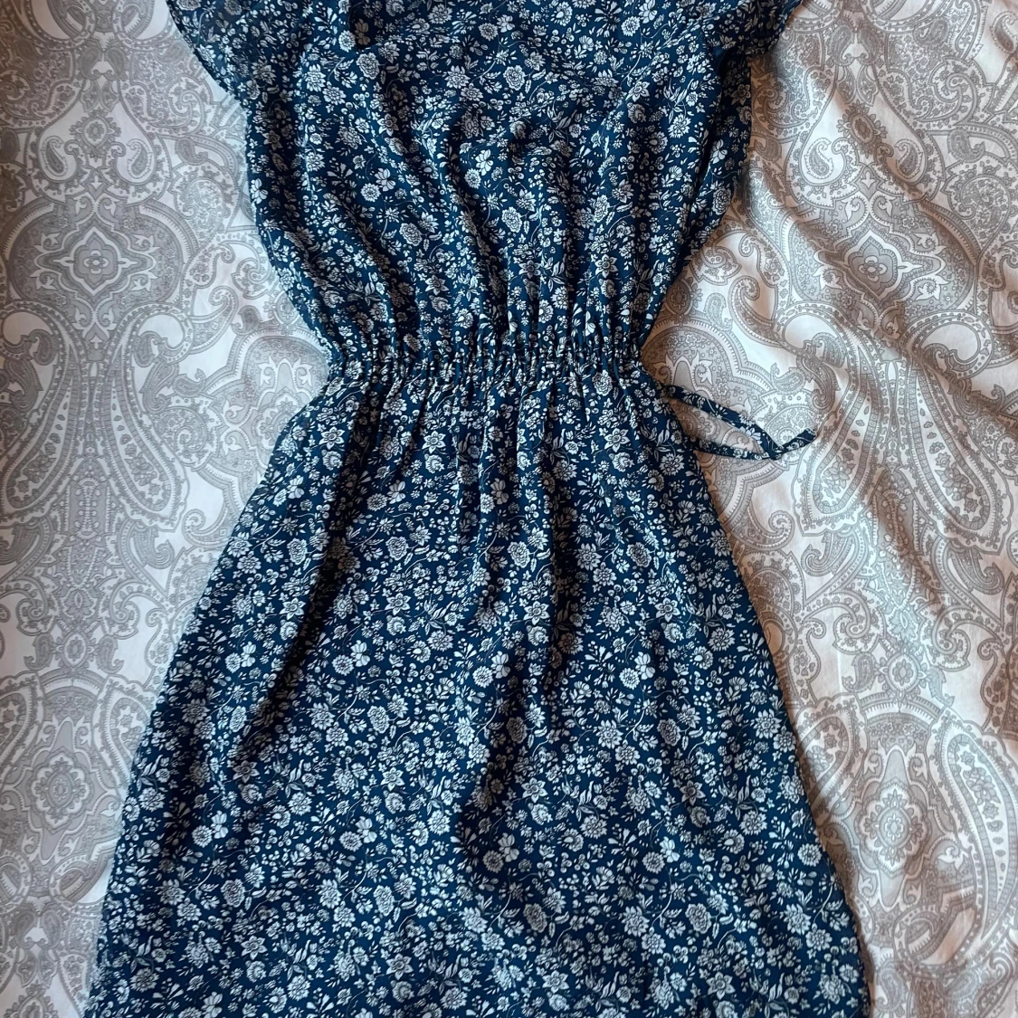 Supersöt blå kortklänning från H&M med vitt blommönster. Klänningen har omlottliv, resår i midjan och korta ärmar. Perfekt för varma dagar och har en luftig känsla. Materialet är lätt och känns skönt mot huden.