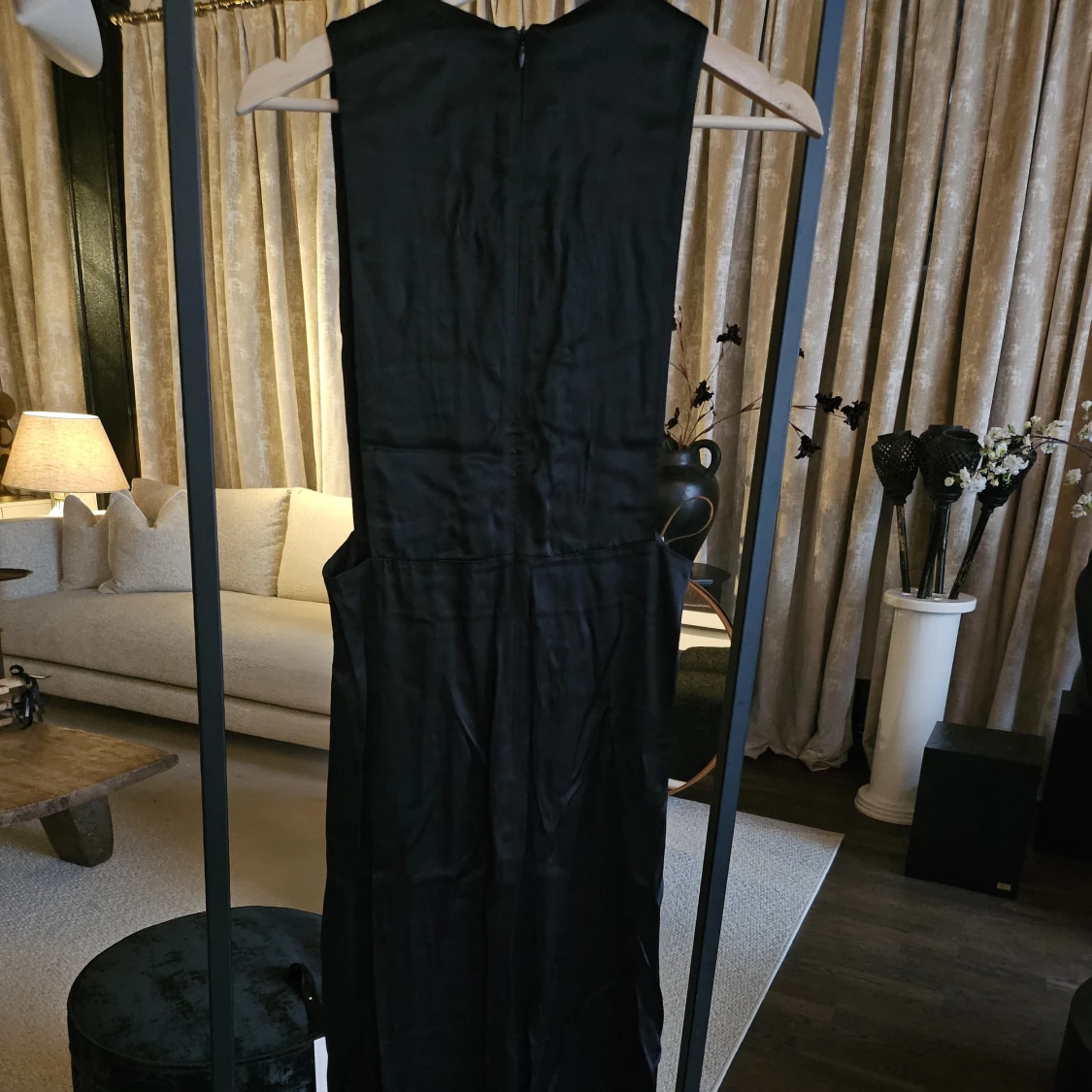 Elegant svart långklänning från H&M i glansigt material med djup v-ringning och volangkant längs urringningen. Ärmlös modell med markerad midja och dragkedja i ryggen. Perfekt för dig som vill sticka ut med en stilren look.