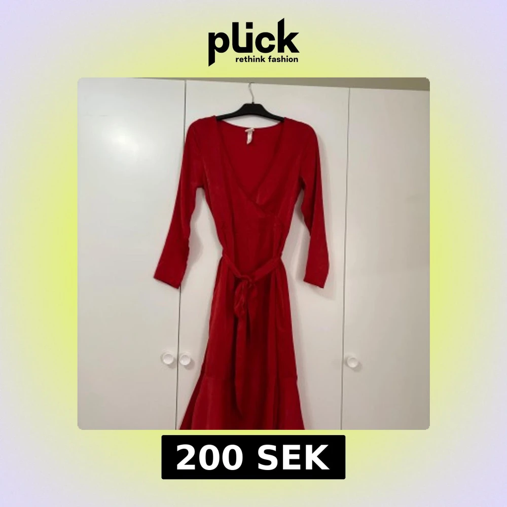 Snygg röd omlottklänning från H&M med v-ringning och knytband i midjan . Materialet är mjukt och följsamt, vilket ger en bekväm passform.