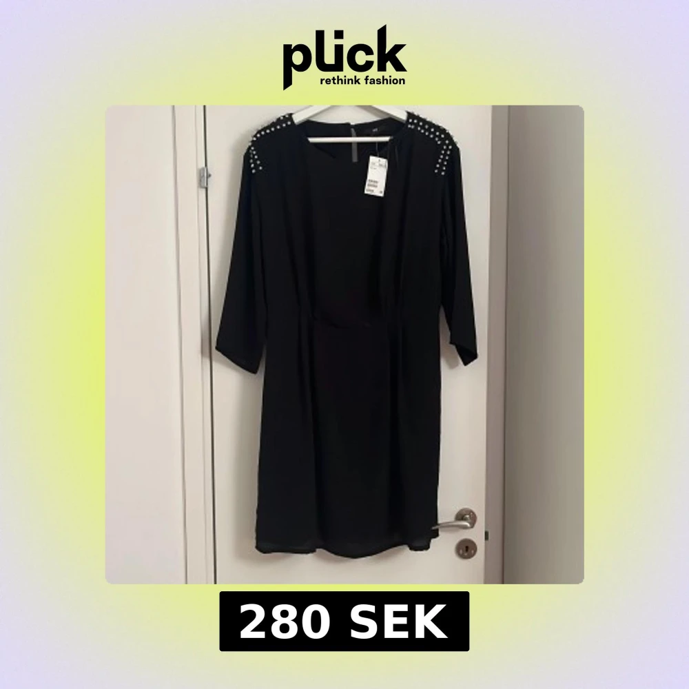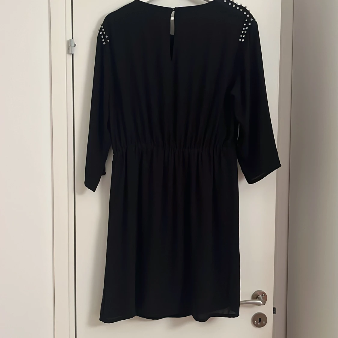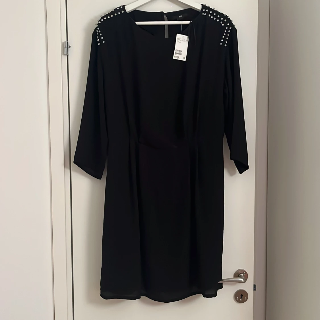 Svart kort klänning från H&M med trekvartsärm och pärldetaljer på axlarna. Klänningen har en rak passform, markerad midja baktill och är tillverkad i ett lätt, flowy material. Perfekt för dig som gillar stilrena plagg med en twist.