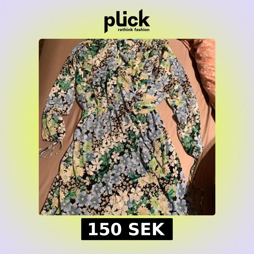 Säljer en färgglad blommig klänning från H&M med långa ärmar och knytband i midjan. Klänningen har ett vackert mönster i grönt, blått och svart, perfekt för vår och sommar.