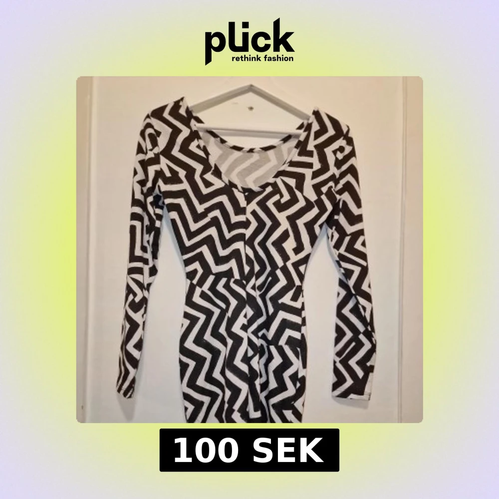Snygg svartvit klänning med ett coolt, geometriskt mönster. Passar bra till både vardag och speciella tillfällen. Garderobsrensning så kika gärna på övriga auktioner.