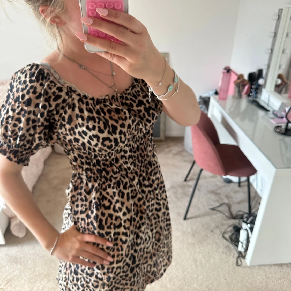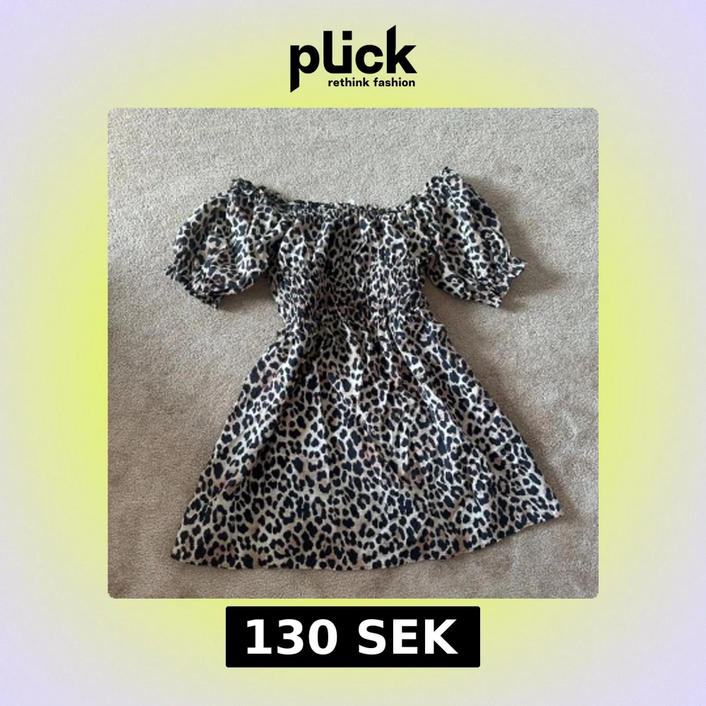 Säljer en superfin kortklänning med leopardmönster och puffiga kortärmar. Klänningen har resår i midjan och kan bäras både offshoulder och med axelband. Perfekt för dig som gillar trendiga och djurmönstrade plagg.