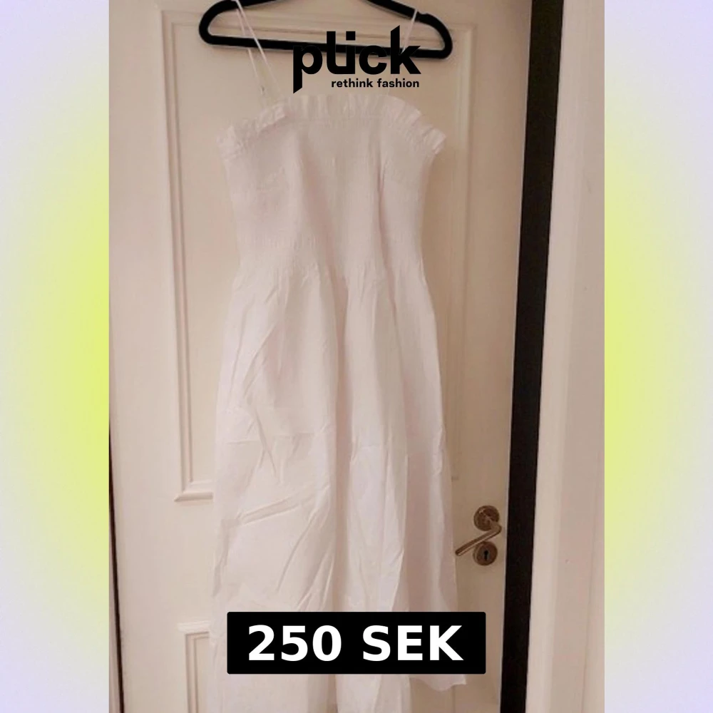 Säljer en vit långklänning med smala axelband och smockad överdel. Klänningen har en söt volangkant upptill och är ärmlös. Materialet känns lätt och luftigt, perfekt för varma dagar. Enkel och stilren design som ger en fräsch vibe.
