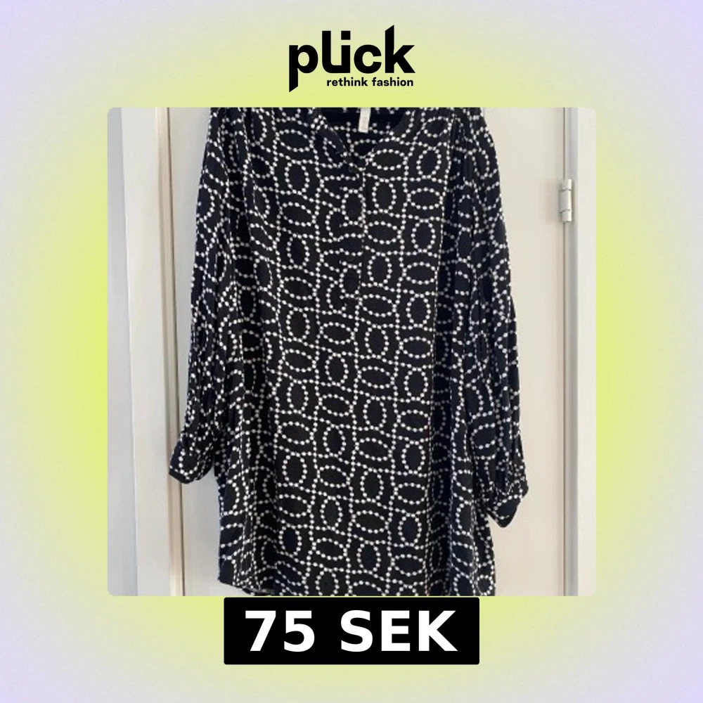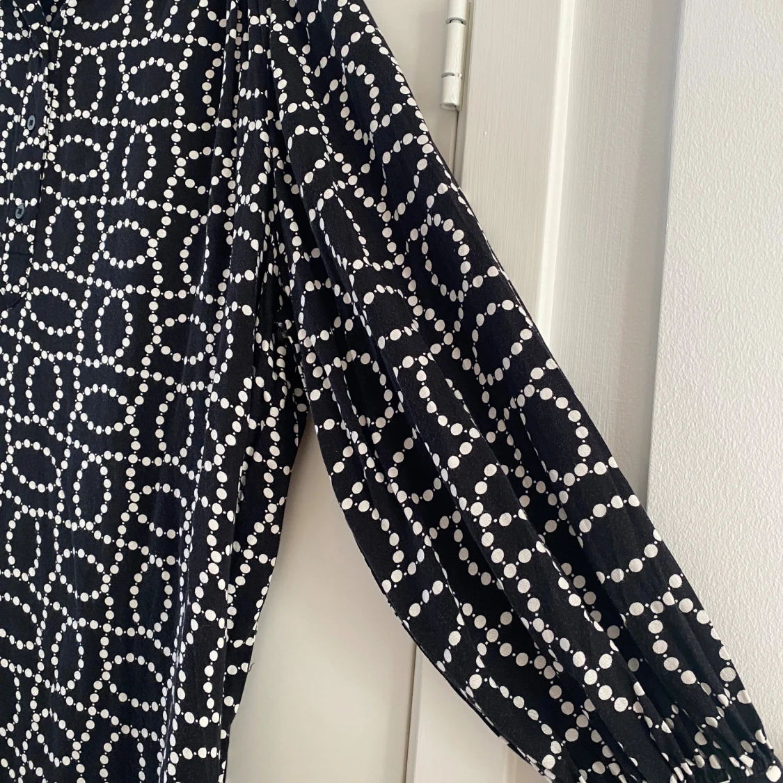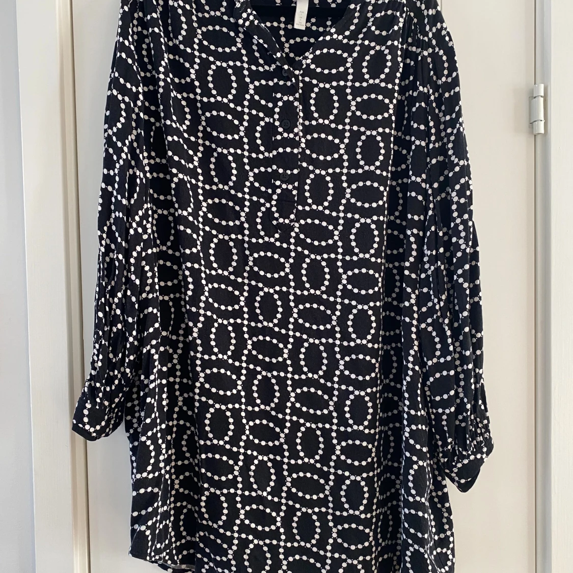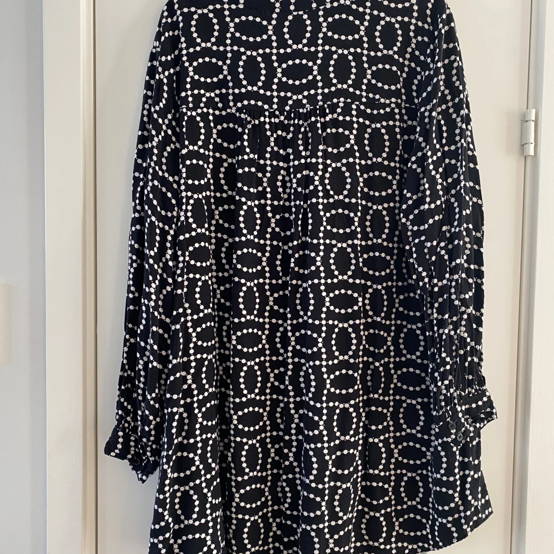 Svart kortklänning från H&M med vitt prickigt mönster i cirklar. Klänningen har långärmade ärmar med lätt puff och knappar framtill. Materialet är mjukt och lätt, perfekt för dig som gillar en loose fit och coolt grafiskt uttryck. Mått Över bröstet: ca 72 cm Längd från axeln och ner: ca 86 cm 100% viskos Kommer från ett djur och rökfritt hem.