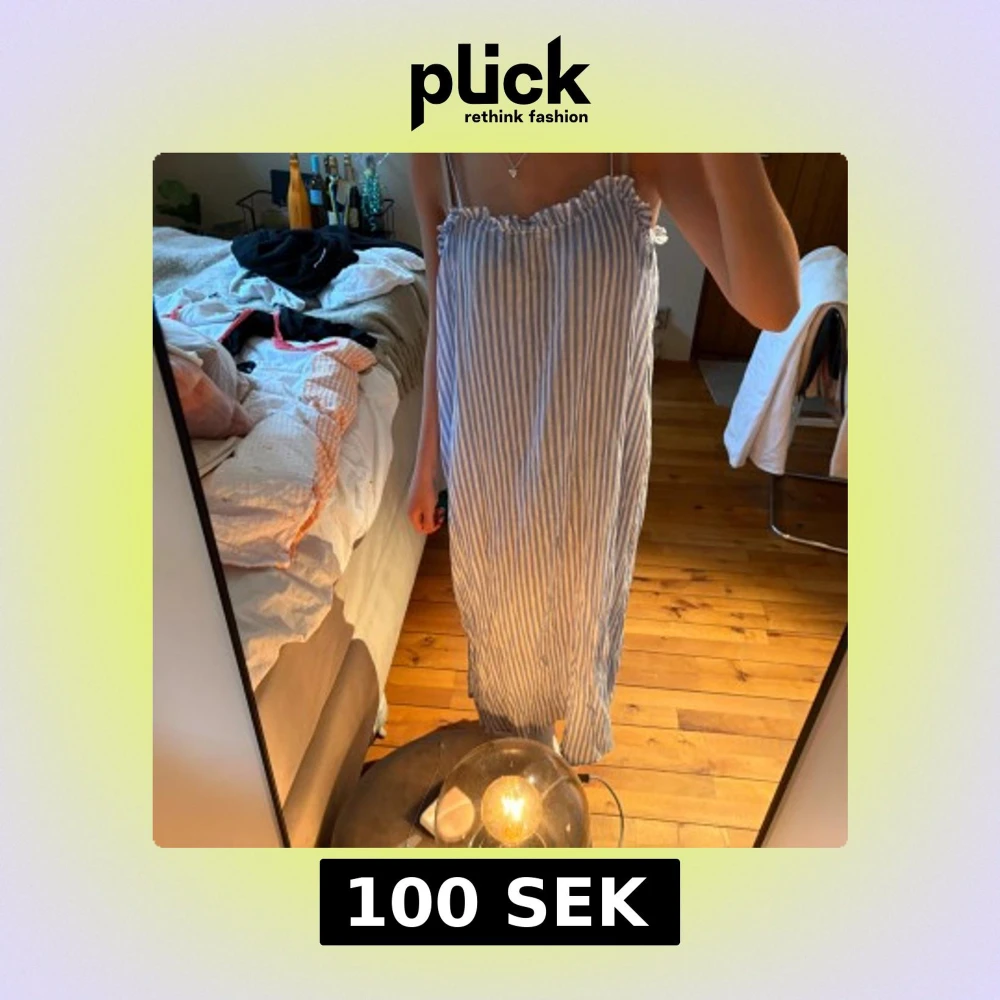 Säljer en söt långklänning med smala axelband och volangkant upptill. Klänningen har blå och vita ränder och är i ett luftigt material, perfekt för varma dagar. Avslappnad passform och enkel att styla med sandaler eller sneakers. Klänningen är i en L men passa i en M.