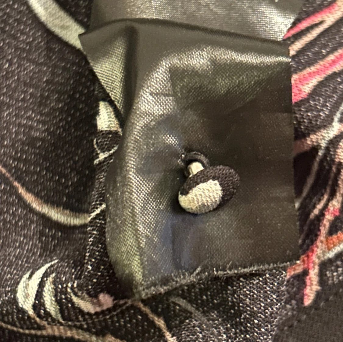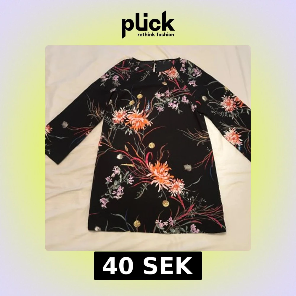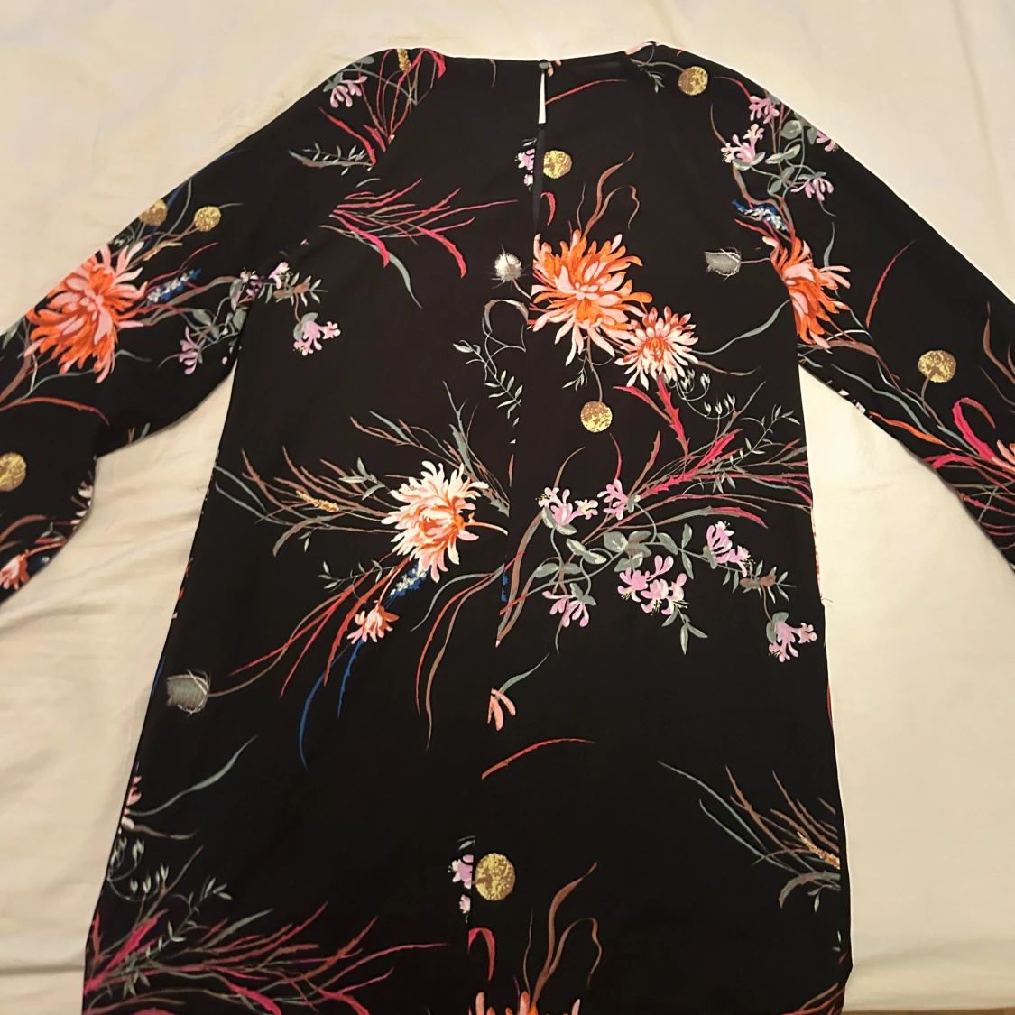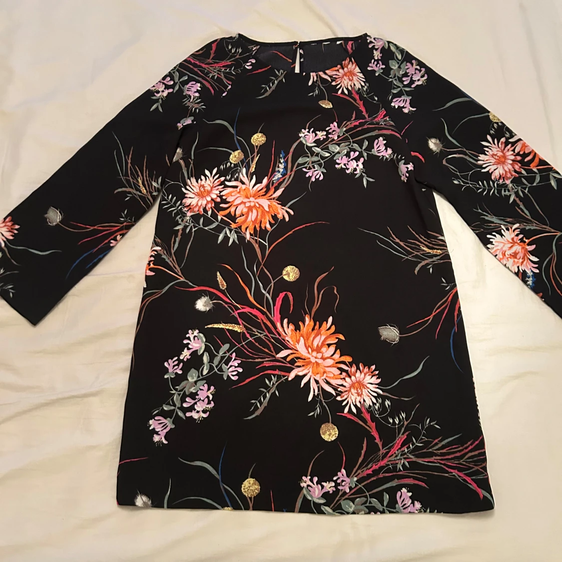 Supersnygg svart kortklänning med färgglada blommor i orange, rosa och lila. Det finns med en extraknapp. Hittar inte storleken men skulle gissa på M