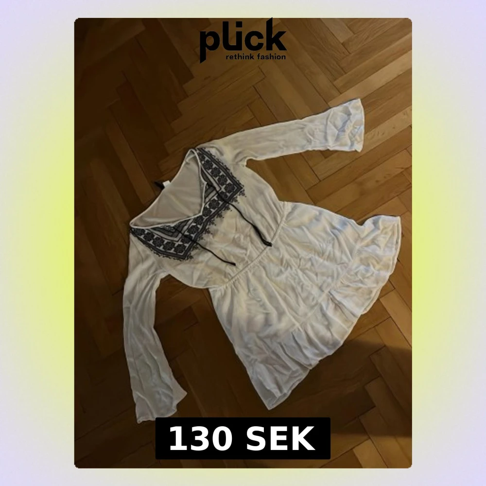 Supersöt vit kortklänning med mörkblå broderi och snörning vid halsen. Klänningen har långa, lätt utsvängda ärmar och volang nedtill. Perfekt för sommarens alla tillfällen och ger en bohemisk vibe.