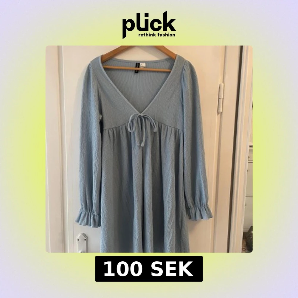Supersöt ljusblå kortklänning från H&M med v-ringning och knyt framtill. Klänningen har långa ärmar med volang vid ärmslut och är gjord i ett strukturerat, krinklat tyg som känns luftigt. Perfekt för vår och sommar!