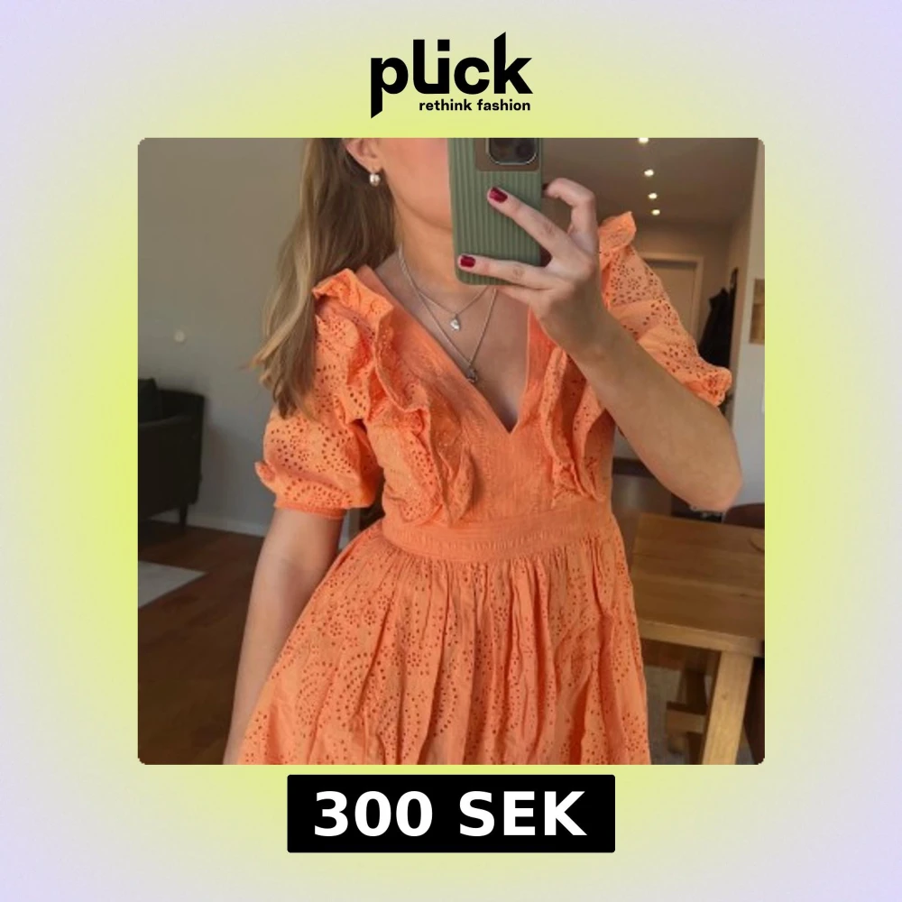 Superfin orange klänning med v-ringning, volangdetaljer och broderat mönster.
