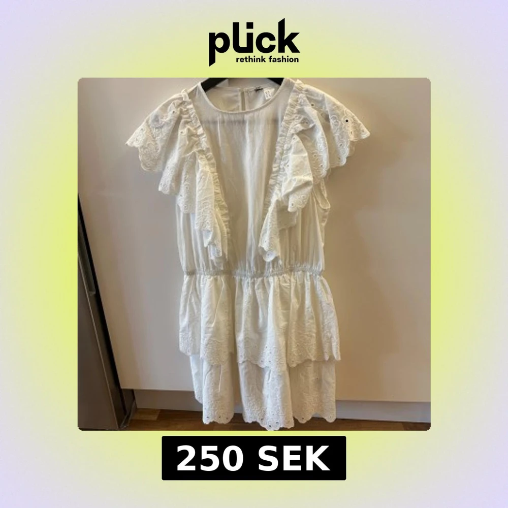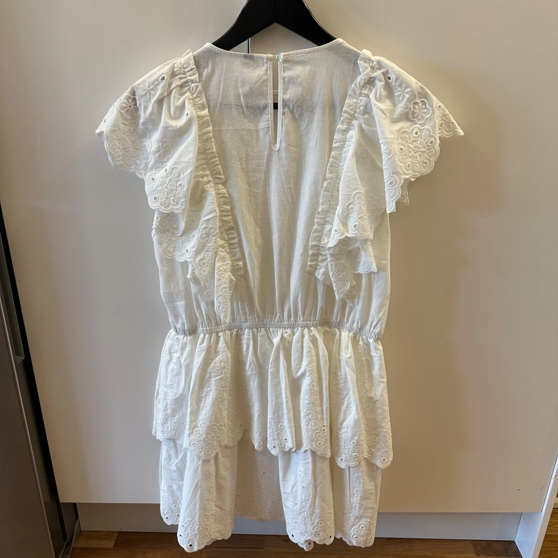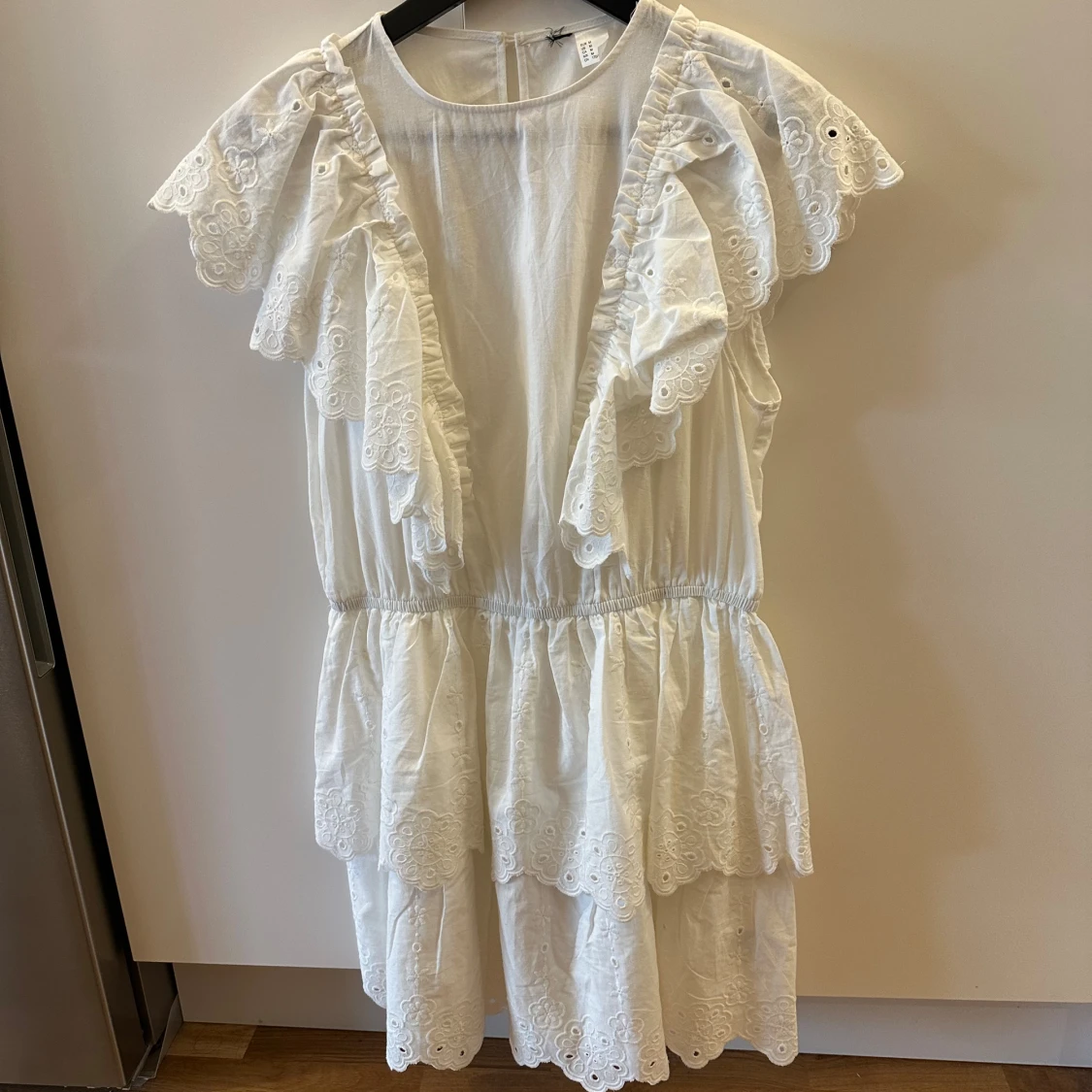 Supersöt vit klänning från H&M med broderade volanger och kort ärm. Klänningen har omlottvolanger längs axlarna och flera lager med broderade detaljer. Perfekt för sommarens alla tillfällen, med elastisk midja och lätt, luftig bomull.