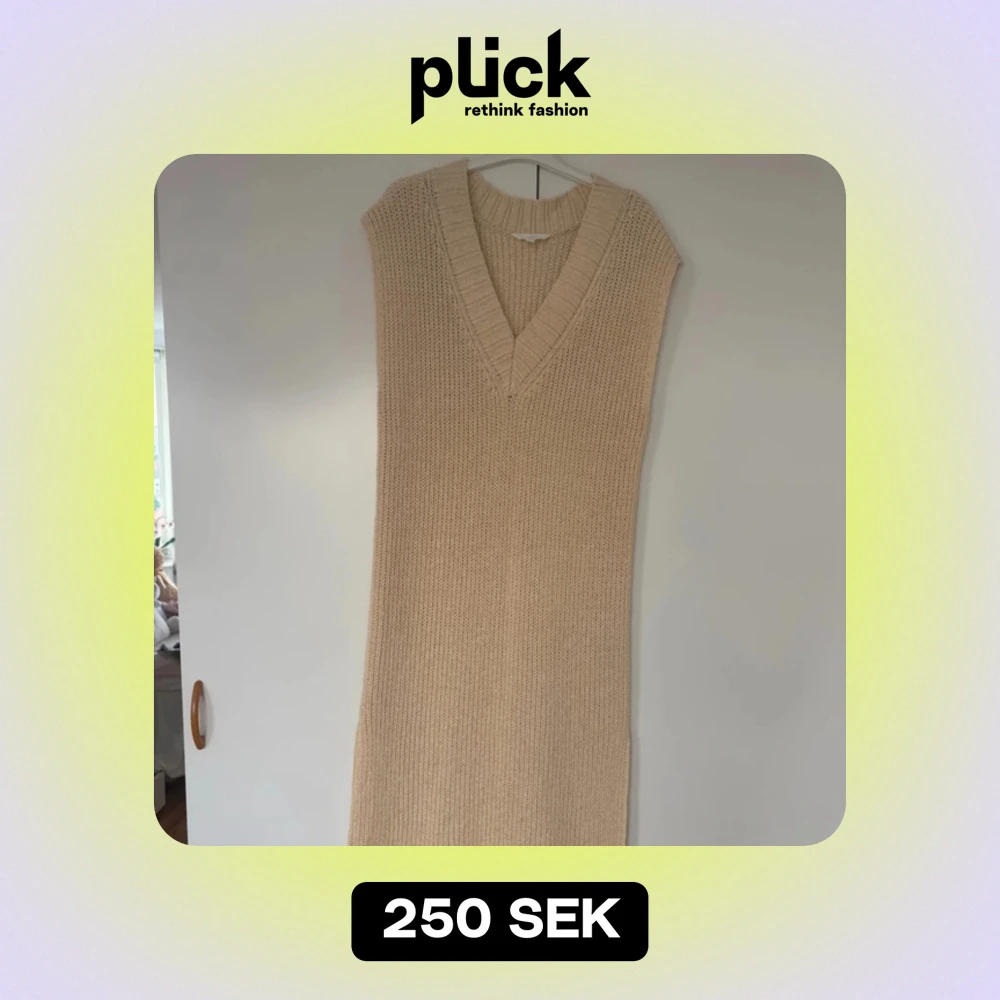 Säljer en superfin aprikosfärgad stickad klänning med v-ringning. Den är ärmlös och har en ribbad kant vid halsen och nederkanten, med slita vid benen från H&M! Använd endast en gång, därav mycket bra skick!