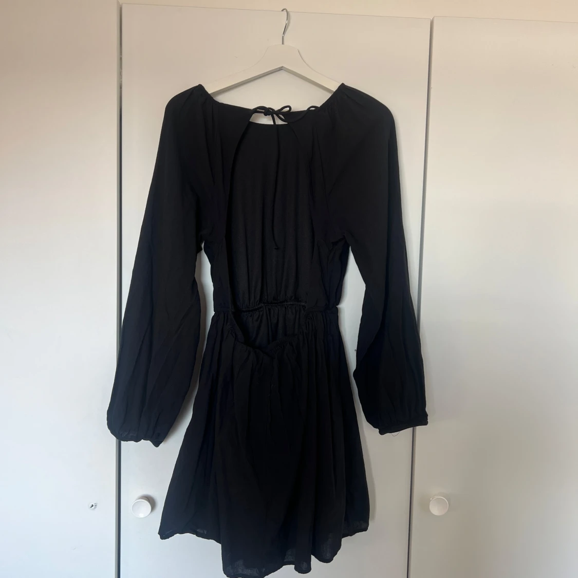 En svart kortklänning med långa, luftiga ärmar och markerad midja. Klänningen har en rund halsringning med knytning i nacken och öppen rygg och ett lätt, flowy tyg som ger en snygg siluett. Perfekt för dig som gillar enkel men stilren look.
